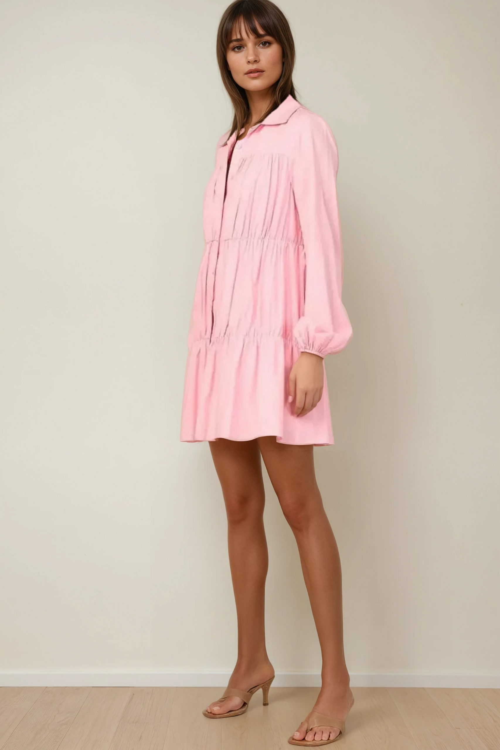 Sweet, soft, and effortlessly chic — the Petal Tier Shirt Dress is made for carefree days and dreamy getaways. Designed in a gentle pink hue, this dress features tiered gathering with soft pleats, a button-down front, and full sleeves with elasticated cuffs. The lightweight fabric moves beautifully with you, while the collared neckline adds a tailored finish. It's the kind of piece you’ll reach for again and again.