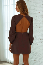 Unapologetically bold and effortlessly chic, the Siren Mini Dress is designed to turn heads. Crafted in a deep espresso tone, this structured silhouette features a high neckline and long puff sleeves for a touch of sophistication. The true showstopper? A dramatic open back with a unique triangular cut-out that adds allure to your every move. Perfect for cocktail nights, date dinners, or any moment you want to feel powerful and unforgettable.