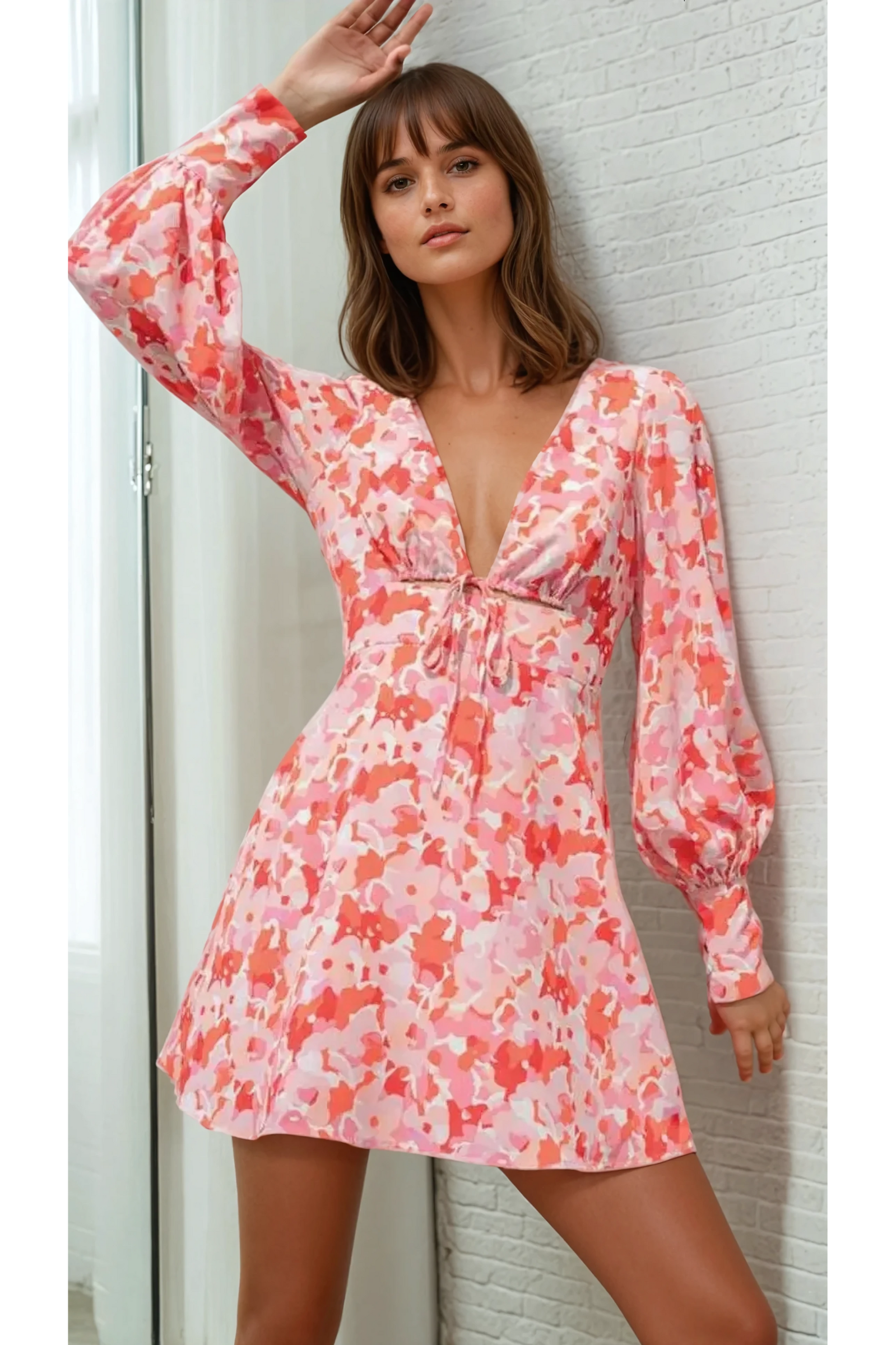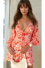 Say hello to summer in the Soleil Mini Dress – a vibrant floral mini that radiates playful charm. Designed in a lightweight, floaty fabric, this dress features a deep V-neckline, adjustable front-tie detail, and billowy long sleeves that create movement with every step. The flattering A-line silhouette makes it perfect for beach days, brunches, or sunset cocktails.