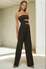 Bold in silhouette, clean in finish — the Emerson Jumpsuit is your go-to for elevated edge. Featuring a strapless, straight neckline and sculpted side waist cut-outs, this piece blends modern tailoring with confident femininity. The full-length pants fall into a soft flare, while the internal silicone grip at the bust keeps everything perfectly in place. A hidden side zipper and lightly structured bodice ensure a smooth, flattering fit for any night out.