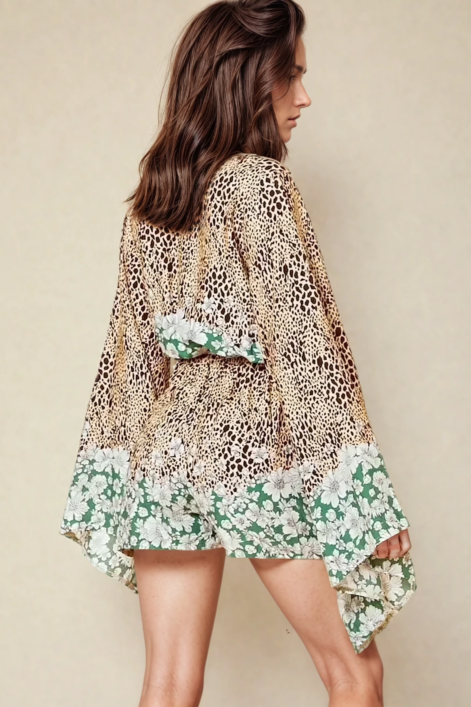 Make a statement in the Jungle Bloom Romper — where fierce meets feminine. Featuring a bold leopard print intertwined with soft green floral panels, this piece is cut in a flowing wrap silhouette that cinches at the waist with a self-tie belt. The plunging neckline and exaggerated wide sleeves bring effortless movement and drama, perfect for balmy nights and standout moments.