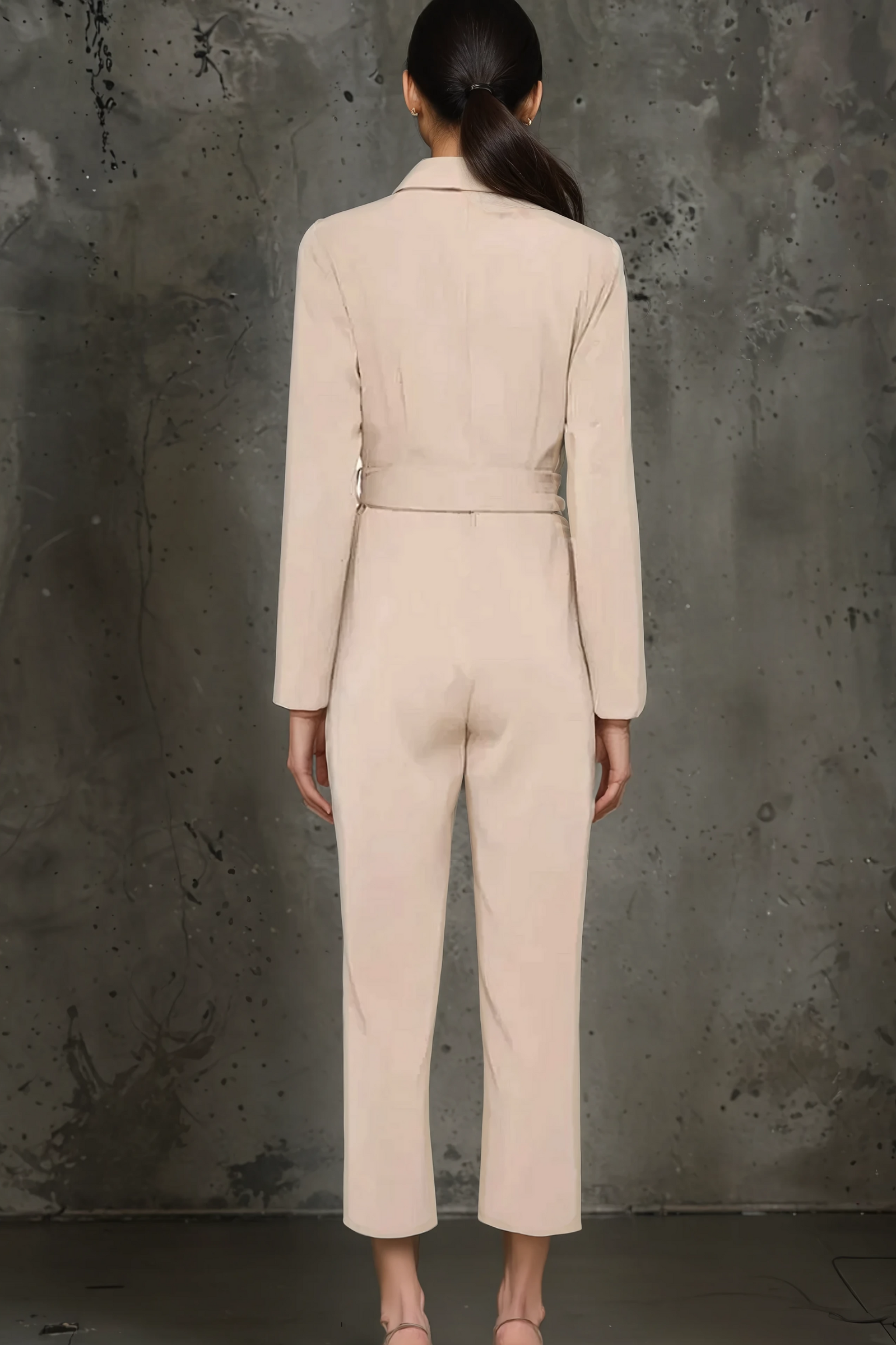 Sophisticated, structured, and effortlessly powerful — the Power Mode Jumpsuit is your go-to look for when confidence is non-negotiable. Designed with sharp tailoring, a double-breasted bodice, and a cinched waist with a self-tie belt, this neutral-toned jumpsuit redefines modern elegance. Whether you're stepping into a meeting or an evening event, this piece commands attention while keeping it chic and minimal.