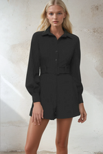 The Rebecca Playsuit is tailored sophistication in one effortless look. Crafted in a sleek black fabric, it features a structured silhouette with a button-up front, full-length sleeves, and a flattering collared neckline. The standout detail — a matching belt cinched at the waist — enhances your shape while adding a refined edge. Perfect for desk-to-dinner styling or elevated weekend wear, Rebecca delivers polish with ease.