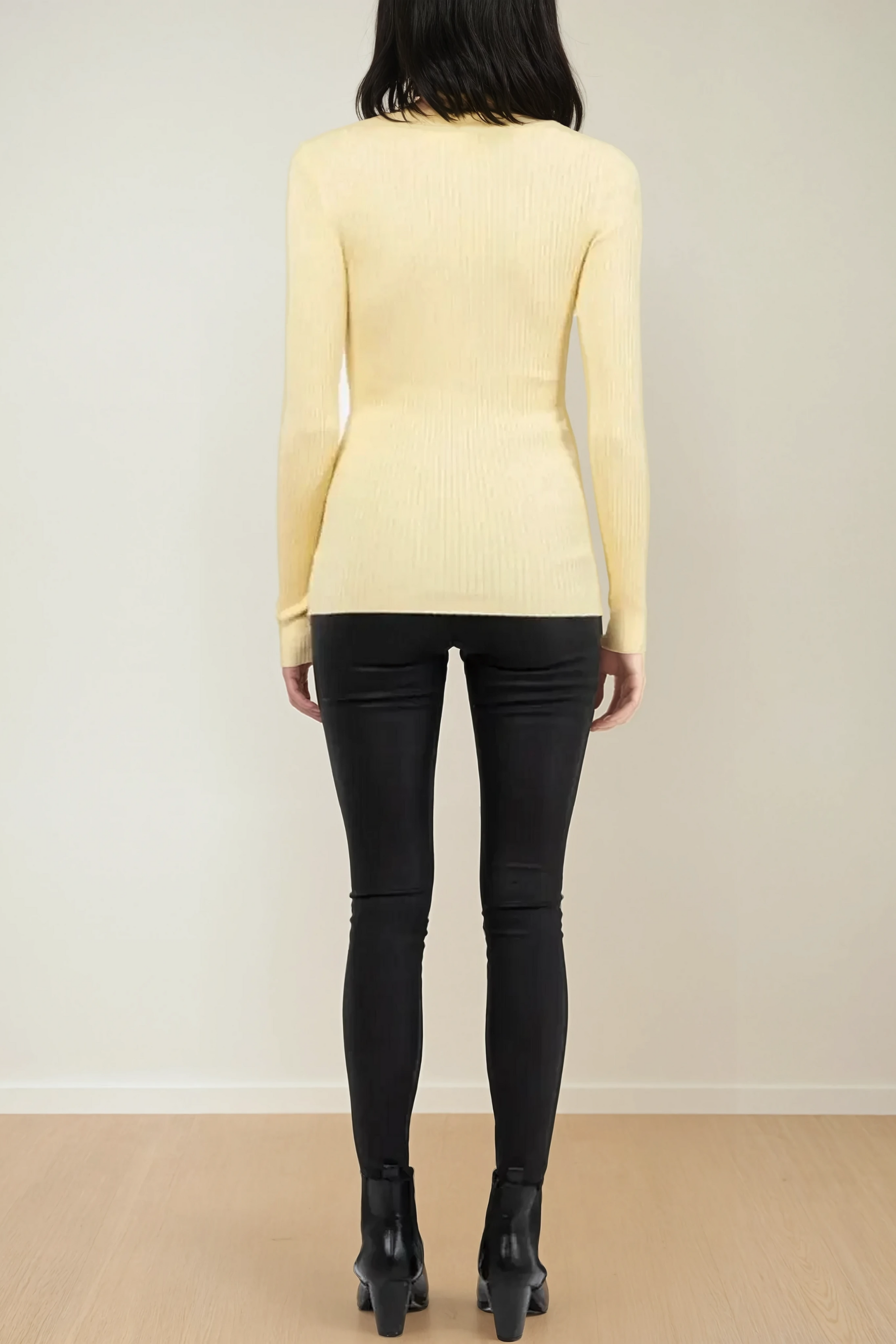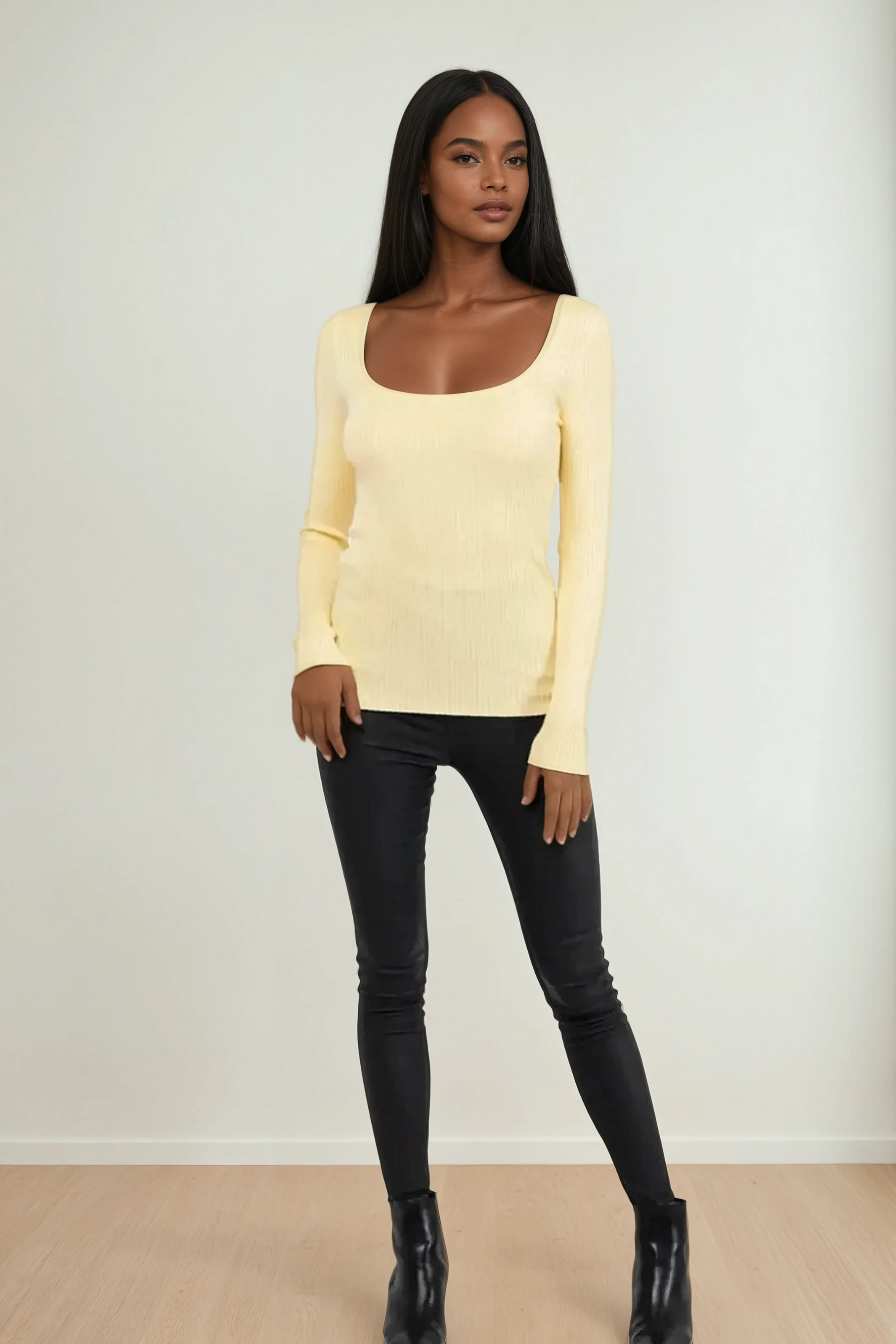 The Honeyveil Ribbed Knit Top is your go-to blend of softness and sophistication. Designed in a buttercream yellow hue, this top features a delicate vertical ribbed texture that flatters the figure while adding quiet detail. With its elegant square neckline and fitted silhouette, it pairs effortlessly with everything from denim to tailored trousers. A must-have knit for layering or shining solo.