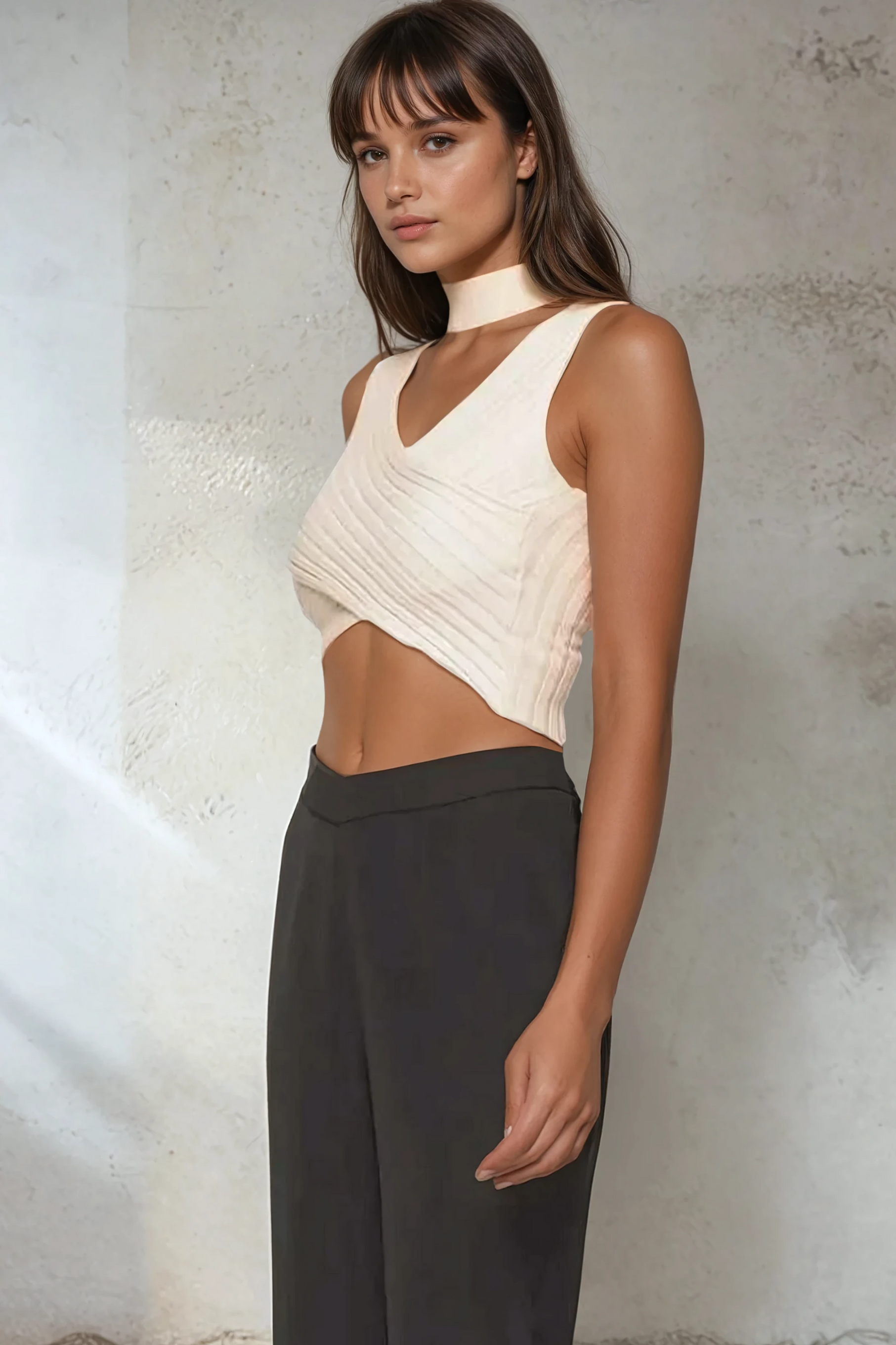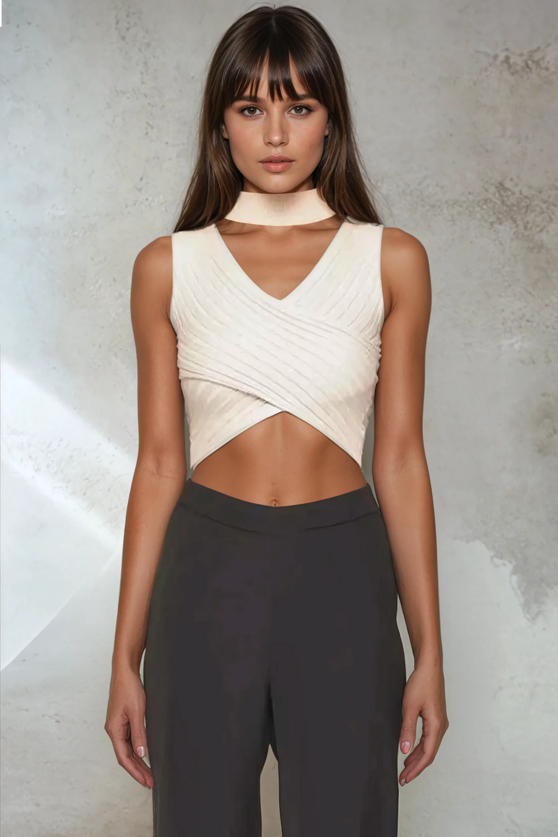 Where elegance meets edge — the Lumina Crossover Crop is sculpted with precision pleating and a high-stretch ribbed knit that wraps and contours the body. Featuring an angular crossover hem and built-in mock neck choker detail, this piece turns a simple neutral into an architectural statement. Pair it with tailored pants or a minimal skirt for an elevated monochrome look.
