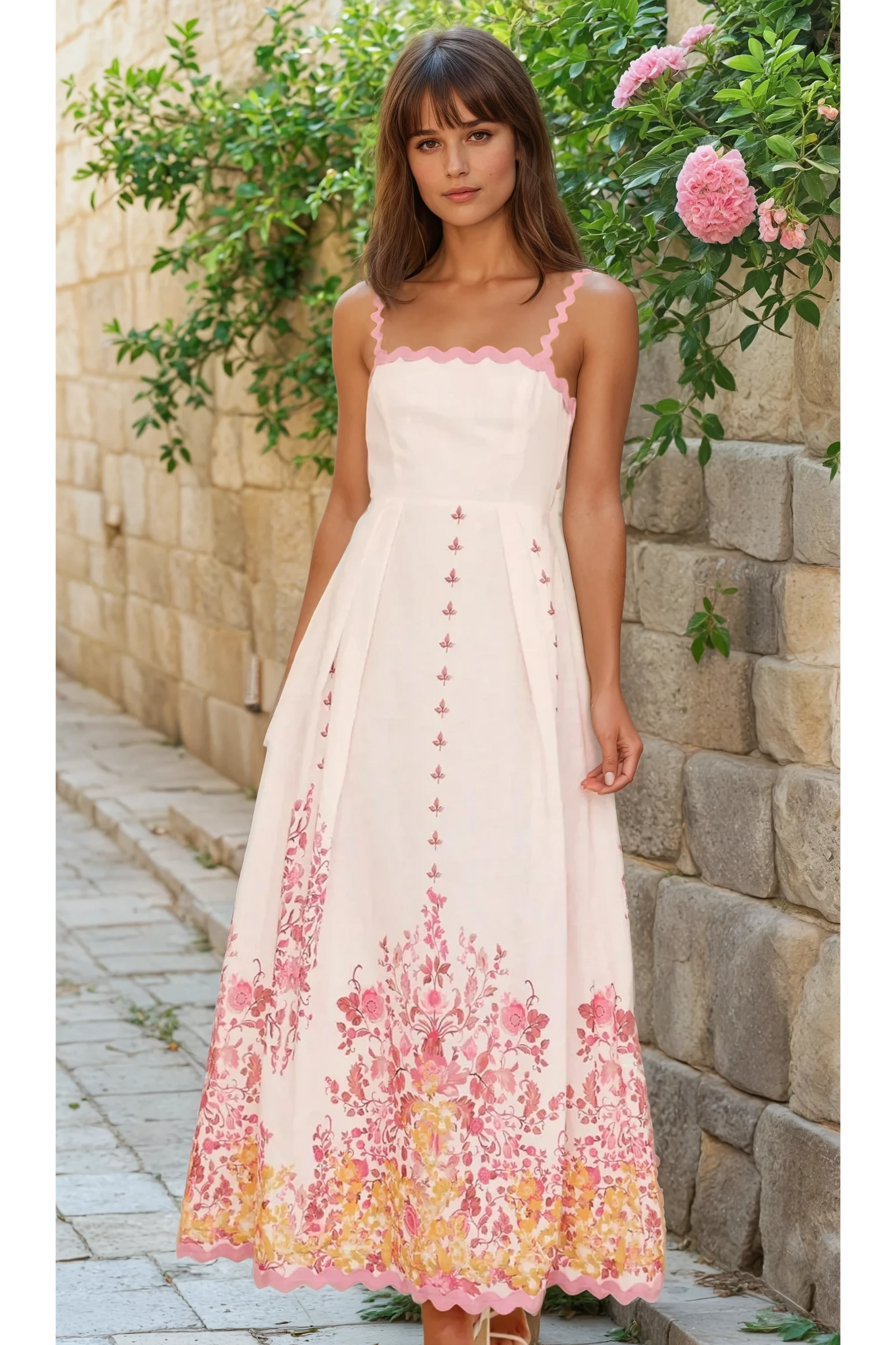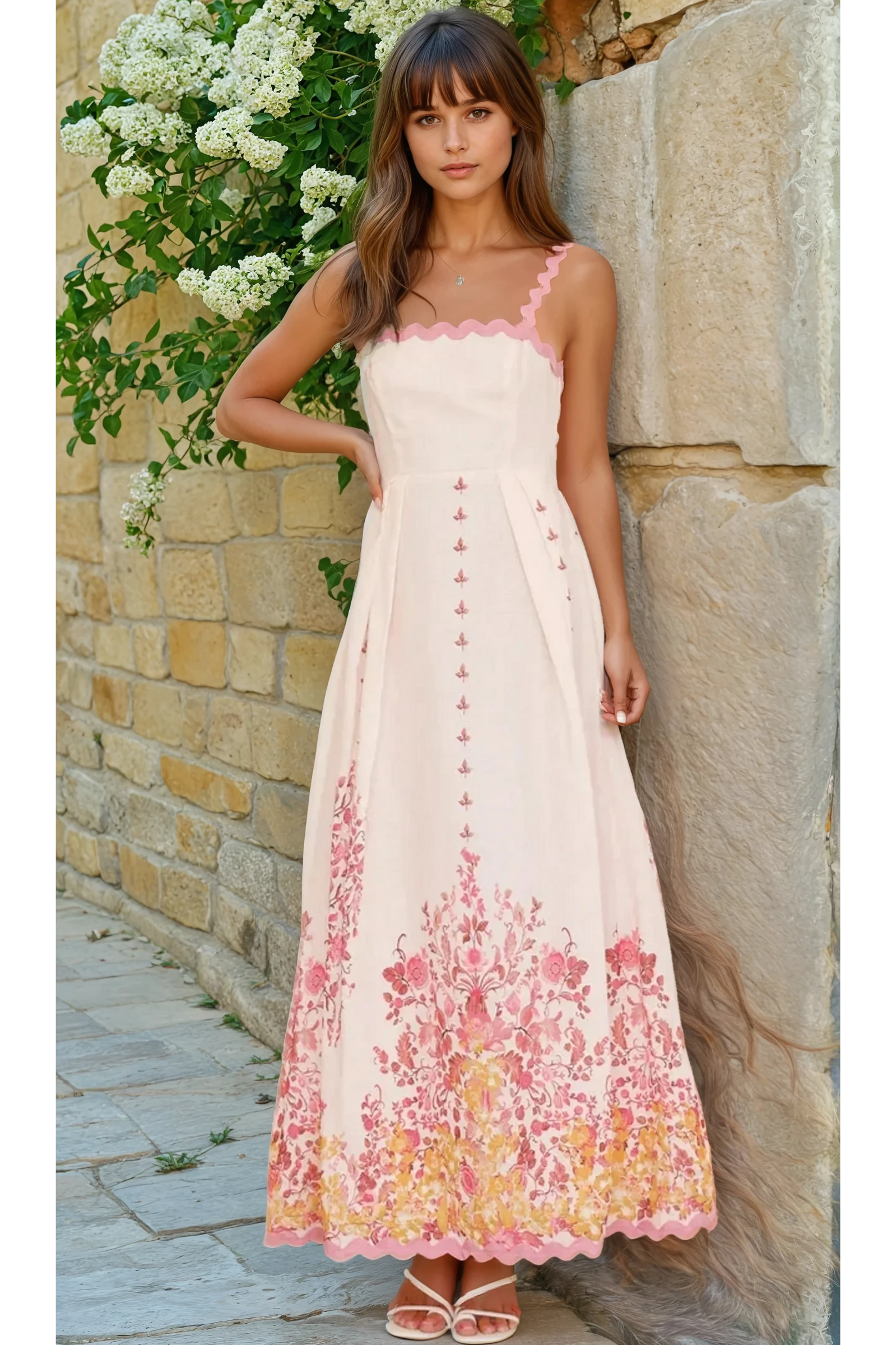Inspired by idyllic countryside gardens and sun-drenched afternoons, the Rustic Bloom Maxi Dress is a breath of fresh air. Featuring a fitted bodice with soft pink scalloped straps and intricate floral embroidery, this piece is a celebration of femininity and timeless beauty. The dramatic bow at the back adds a touch of vintage romance, making it perfect for outdoor events, summer parties, or sunset strolls.
