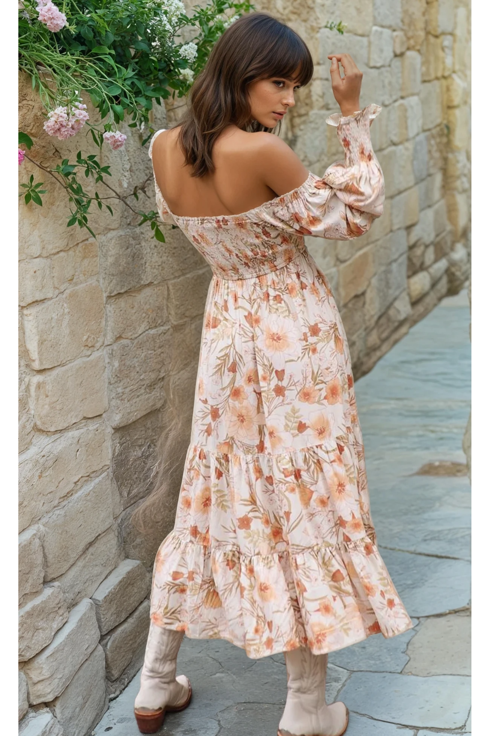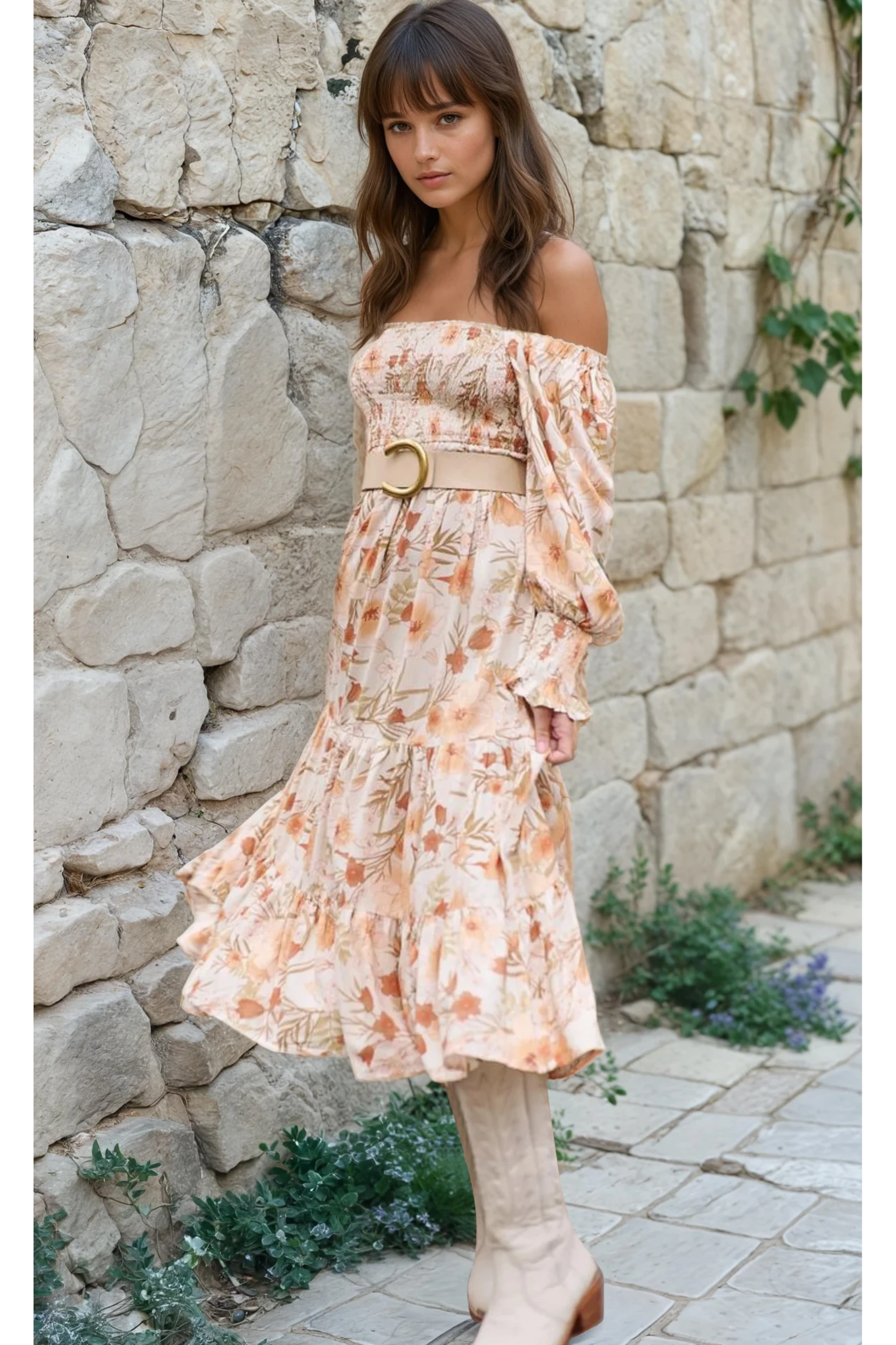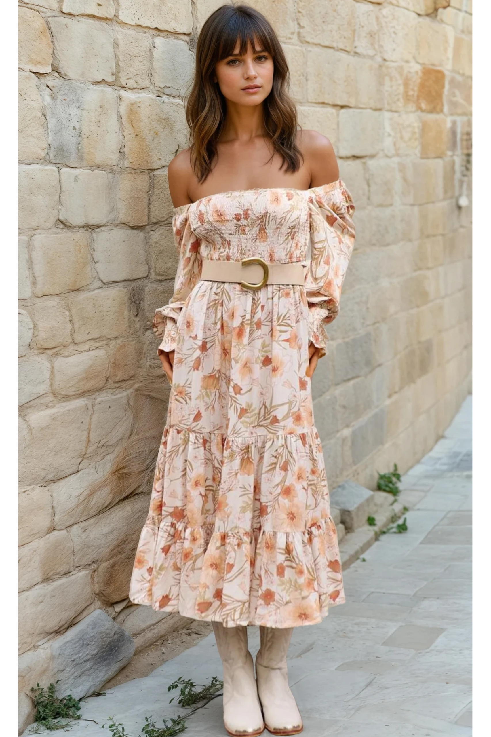 Channel romantic countryside charm in the Sienna Bloom Maxi Dress, a floaty floral silhouette designed to feel both feminine and free. Crafted in a soft, lightweight fabric with a muted peach and cream floral print, this off-the-shoulder maxi features a shirred bodice that hugs your shape and flows into a tiered skirt with gentle volume. Long puff sleeves with frilled cuffs add to the soft, vintage-inspired mood. Finished with a removable belt to accentuate the waist, this dress is made for long lunches, garden parties, and sun-drenched escapes.