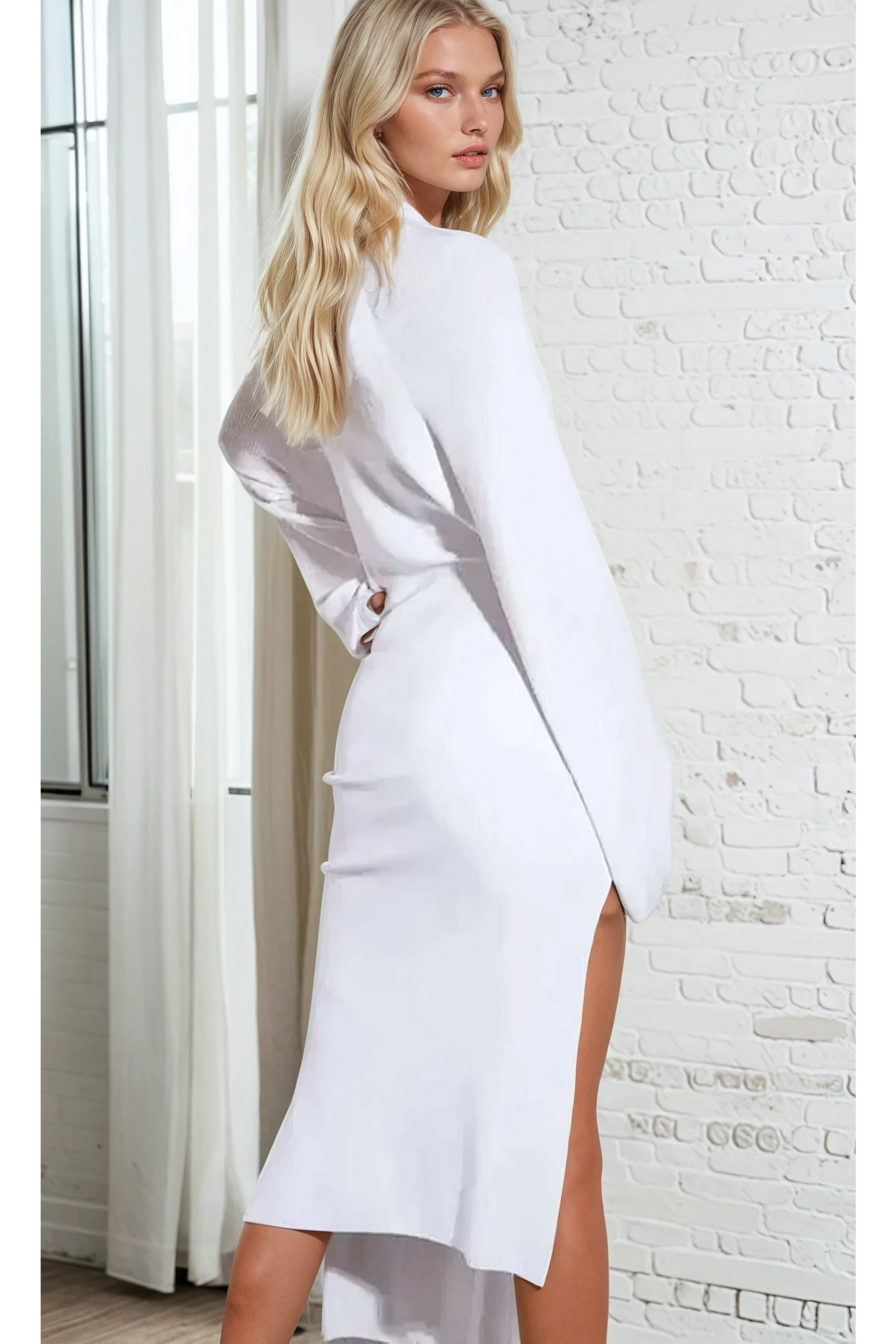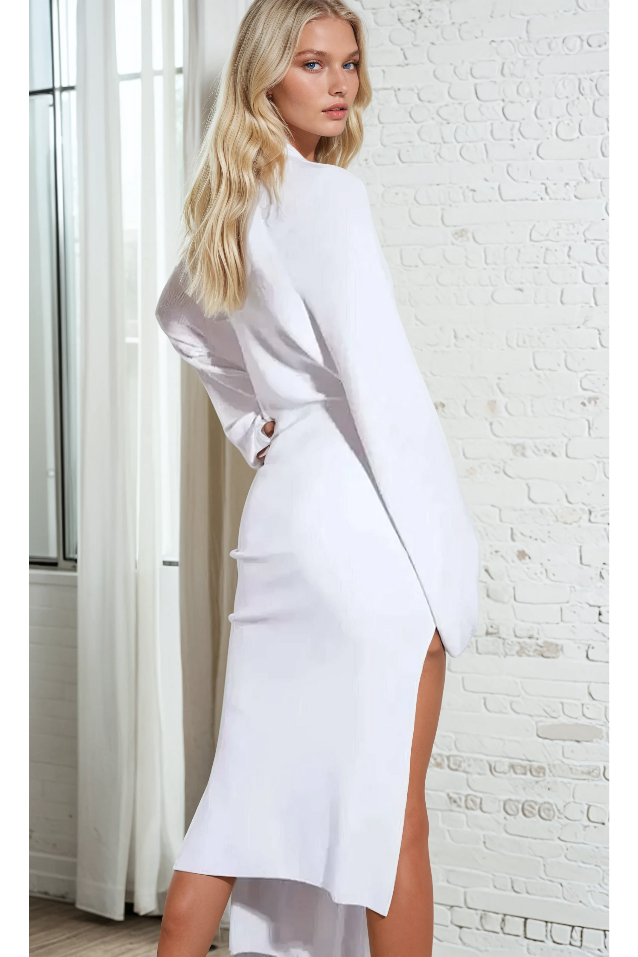 Elevate your cold-weather wardrobe with the Winter Tie Knit Dress — where comfort meets sleek sophistication. Crafted from a thick, warm knit, this piece offers a sculpted silhouette with relaxed elegance. The front tie detail allows for flattering waist definition, while the high neckline and thigh-high split add a modern, confident edge.