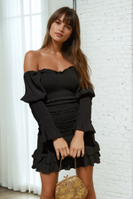 Soft meets sultry in the Dreamz Off Shoulder Dress. Designed with a flattering shirred bodice, romantic long sleeves, and delicate ruffle trims, this mini dress is the ultimate blend of elegance and ease. Its off-shoulder silhouette is both timeless and alluring, making it perfect for everything from rooftop cocktails to date nights. It hugs in all the right places and moves with subtle texture and charm.