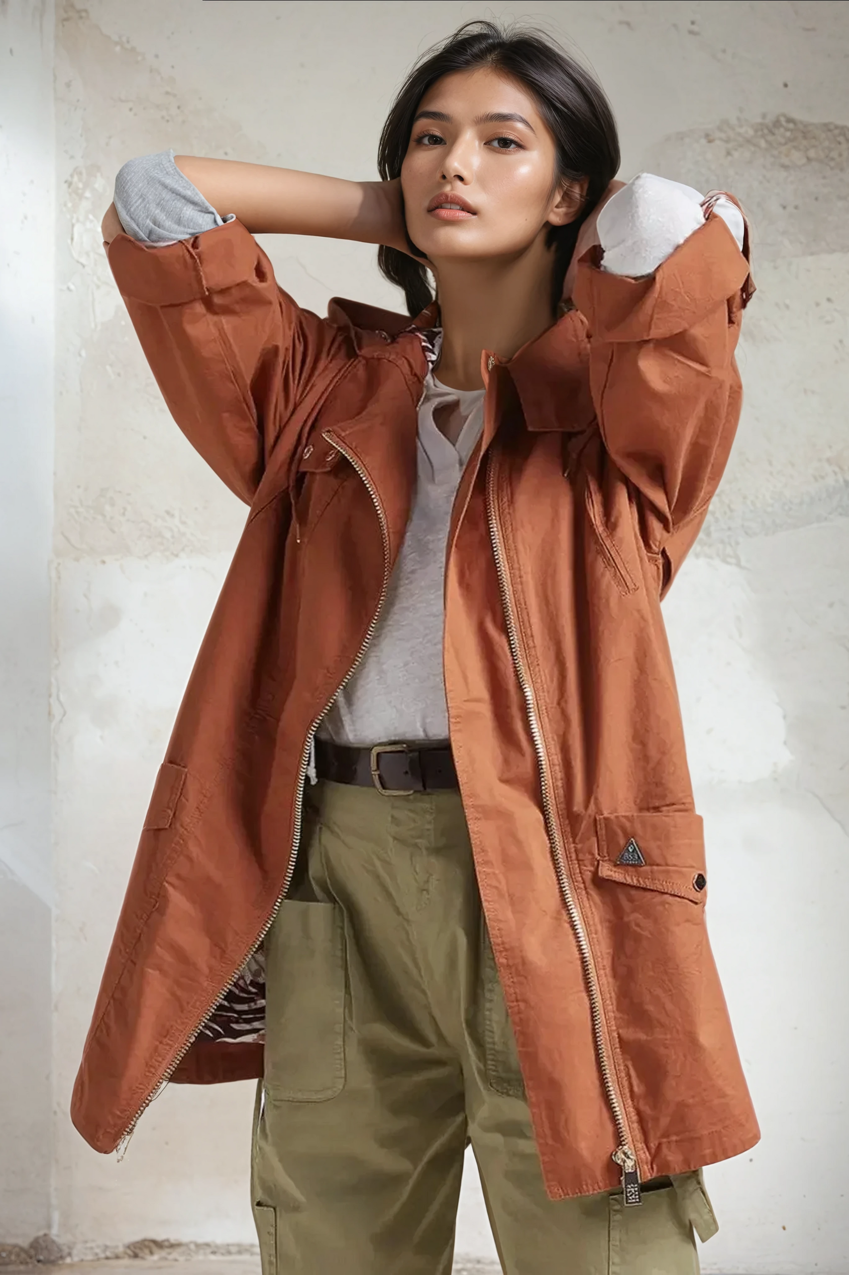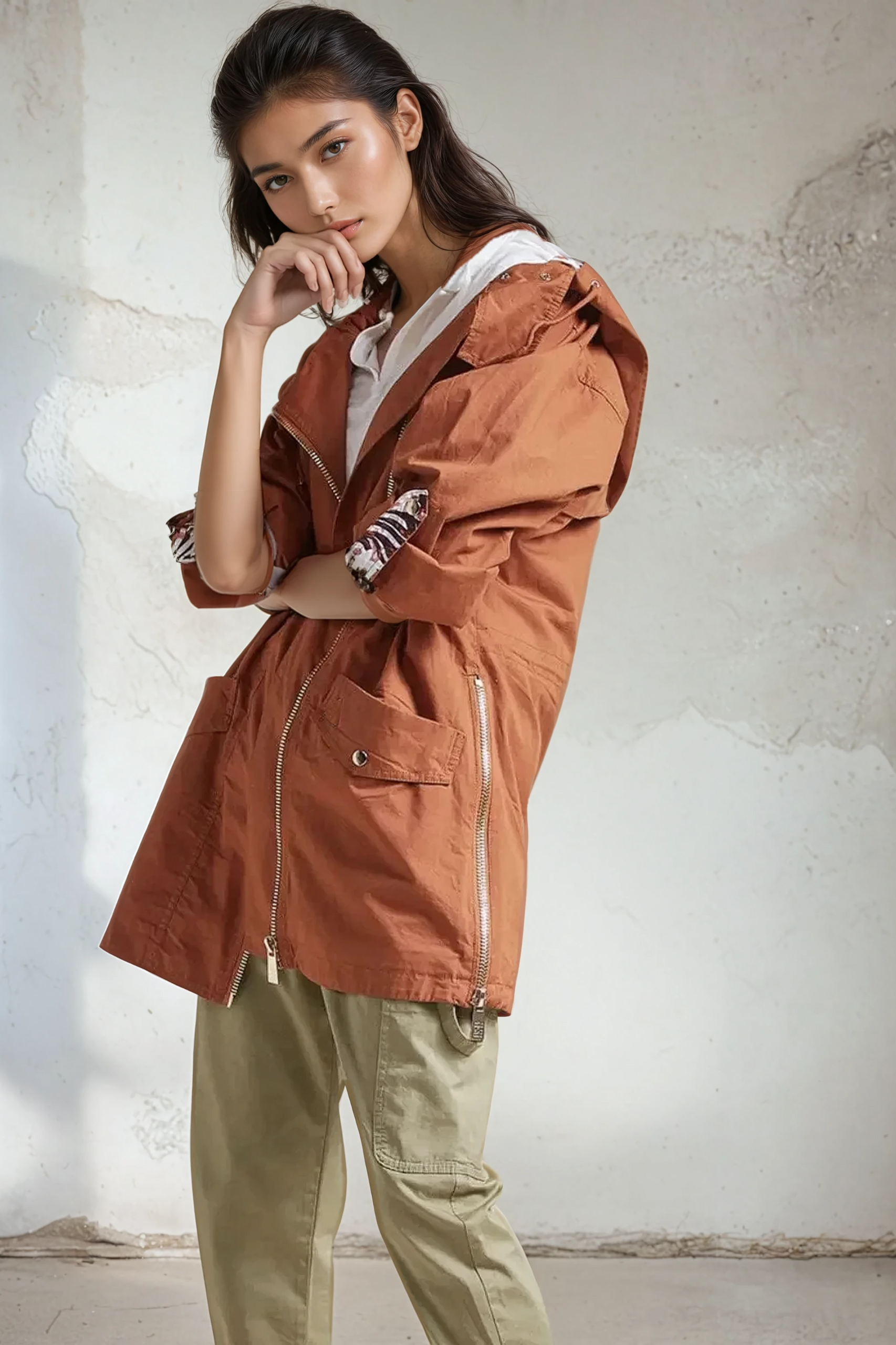 The Unfollow Parka is your go-to outerwear when bold meets functional. Designed with a relaxed oversized fit, this hooded parka features contrast printed lining in a vivid floral and leaf motif that pops against the rich terracotta exterior. Finished with "UNFOLLOW" embroidery across the back, zip-open side vents, drawcords at the hem and hood, and tabbed sleeves with stitched patch detailing — it’s a jacket made to stand out without saying a word.
