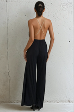 Own the evening in the Midnight Muse Chain Jumpsuit. This captivating silhouette balances elegance and edge with its draped cowl neckline, luxurious gold-tone chain straps, and statement open back. Designed with fluid wide legs and thigh-high slits, this piece elongates the frame while exuding effortless glamour. A show-stopping look for sunset soirées or upscale nights out.