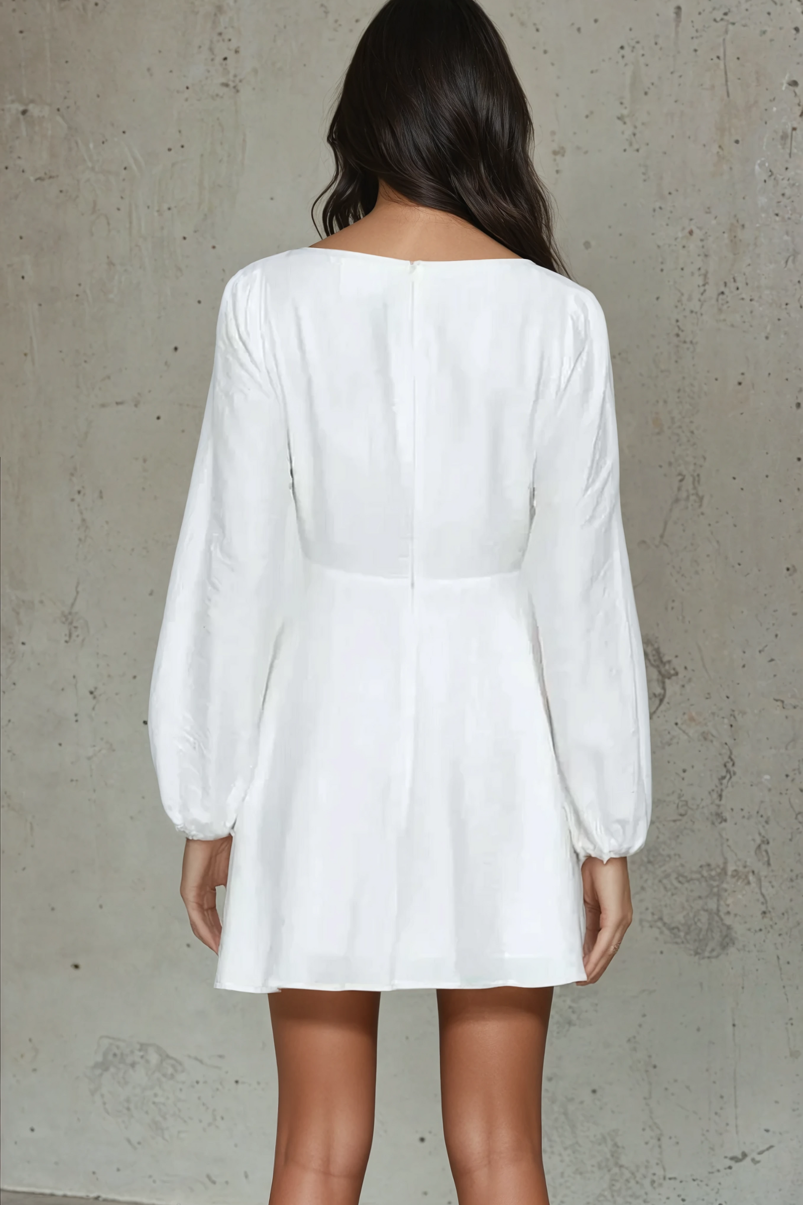 The Celina Ring Mini Dress is where playful charm meets feminine edge. Crafted in a luminous textured fabric, this mini dress features a striking circular cut-out at the front, cinched with a statement ring that draws the eye. Voluminous long balloon sleeves balance the flirtatious front, while the flared skirt brings effortless movement to every step. A hidden zip at the back keeps the silhouette sleek, making it the perfect piece for long lunches or moonlit soirées.