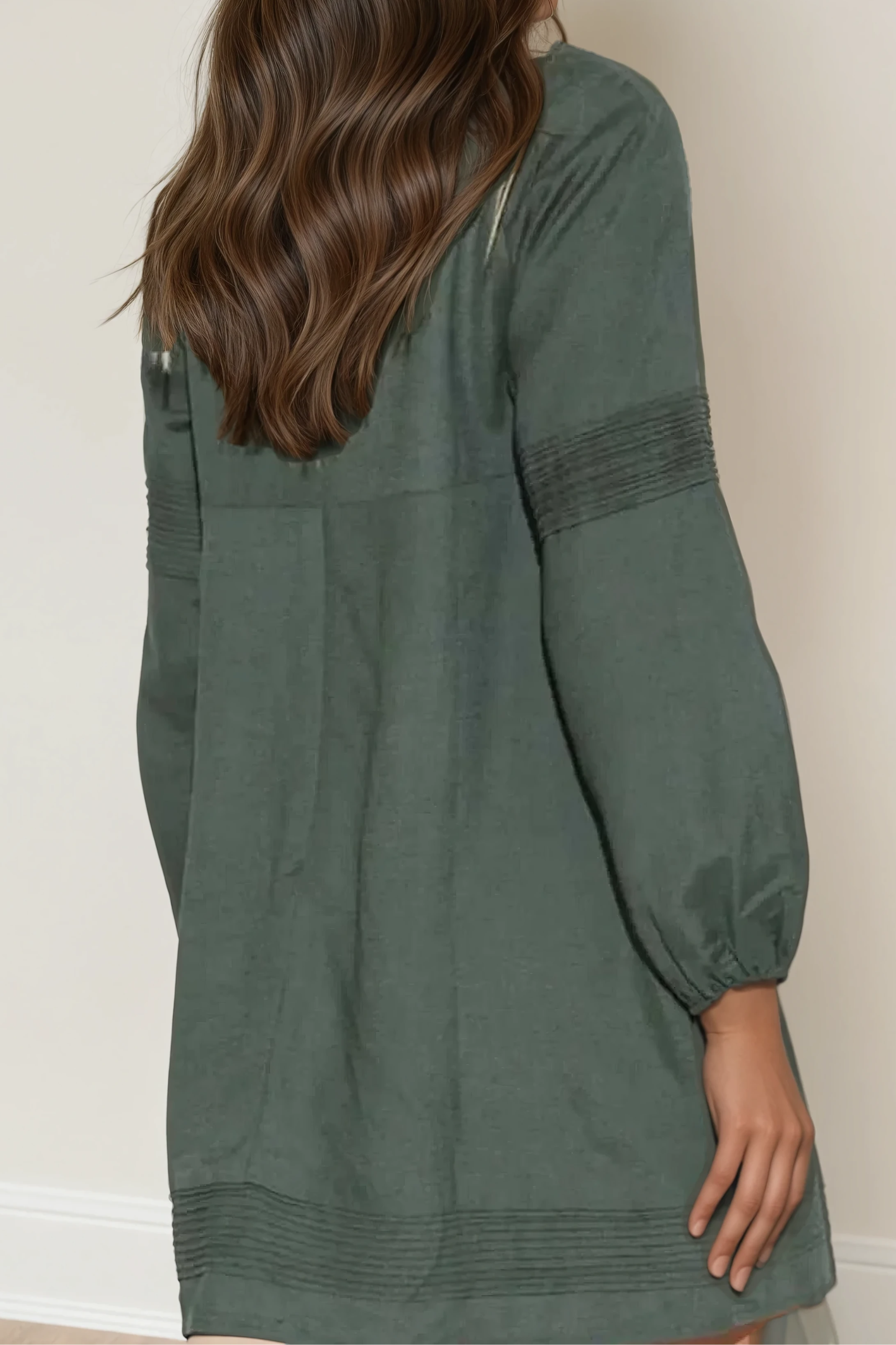 • Detail: Horizontal pin-tuck stitching on sleeves and hem