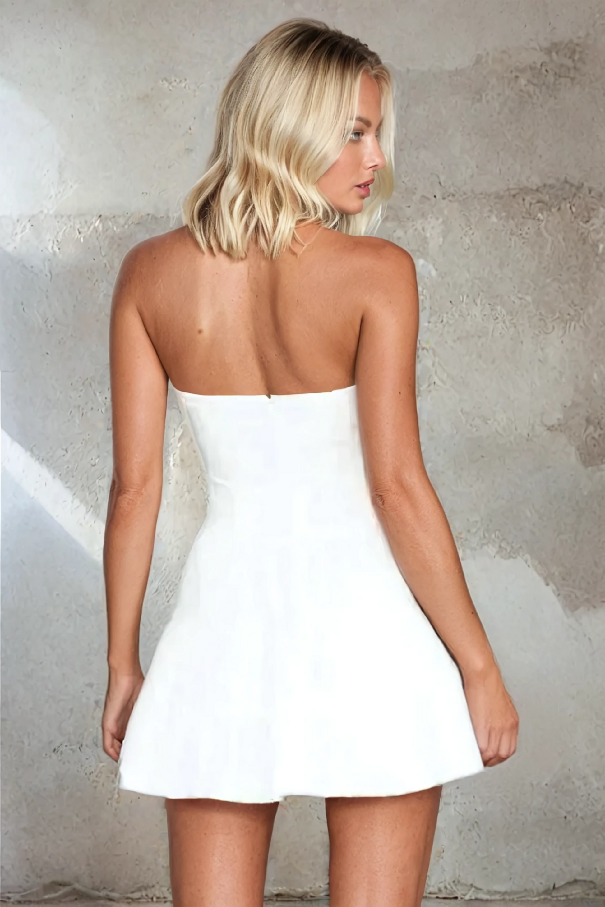 Elevate your summer nights in the Liora Strapless Mini Dress—a clean-cut silhouette with quietly intricate details. Crafted from embossed floral fabric, this piece catches the light with understated elegance, though the pattern may appear subtle in photos due to lighting. The strapless neckline and fitted bodice flow into a softly flared mini skirt, creating the perfect balance of structure and movement. Ideal for garden parties, birthdays, or elevated evenings out.