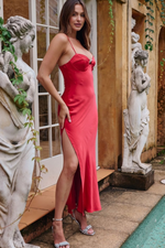 Turn every entrance into a statement with the Fleur Rouge — a sultry satin gown designed for unforgettable nights. Cut from lustrous scarlet satin, this dress drapes like liquid fire over your silhouette, hugging in all the right places. The structured bust is adorned with a dazzling diamanté floral brooch, adding a touch of timeless glam to its flirtatious neckline. A thigh-high slit elongates the leg, while delicate spaghetti straps frame the shoulders for an effortlessly feminine finish. Bold, radiant, and unapologetically muse-worthy — this is the moment, and you are the main character.