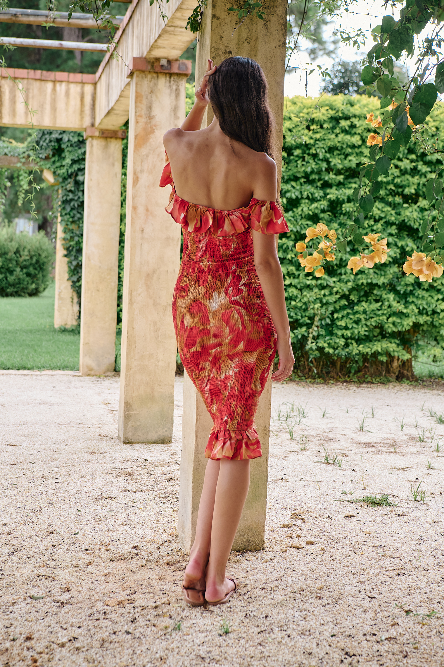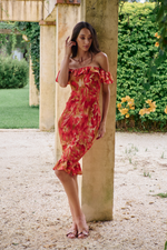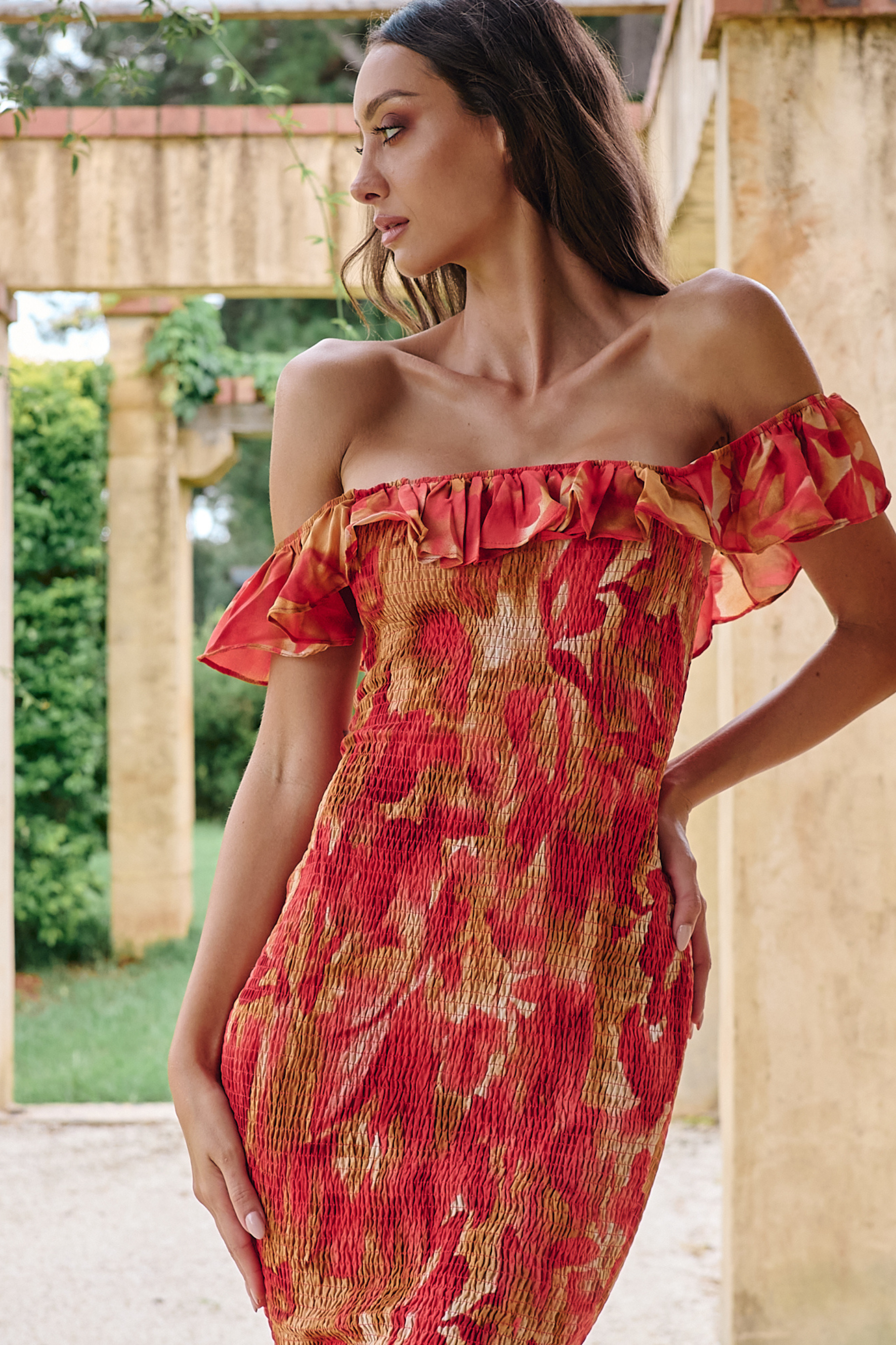 Bring the heat in the Soleia Ruffle Midi Dress, a figure-loving statement piece that captures the essence of summer romance. Designed in a smocked stretch fabric that molds to your shape, this off-shoulder silhouette features vibrant floral hues, ruffled edges, and a playful fluted hem. The elasticated neckline and sculpted fit make it both flattering and easy to wear—from garden parties to tropical getaways.