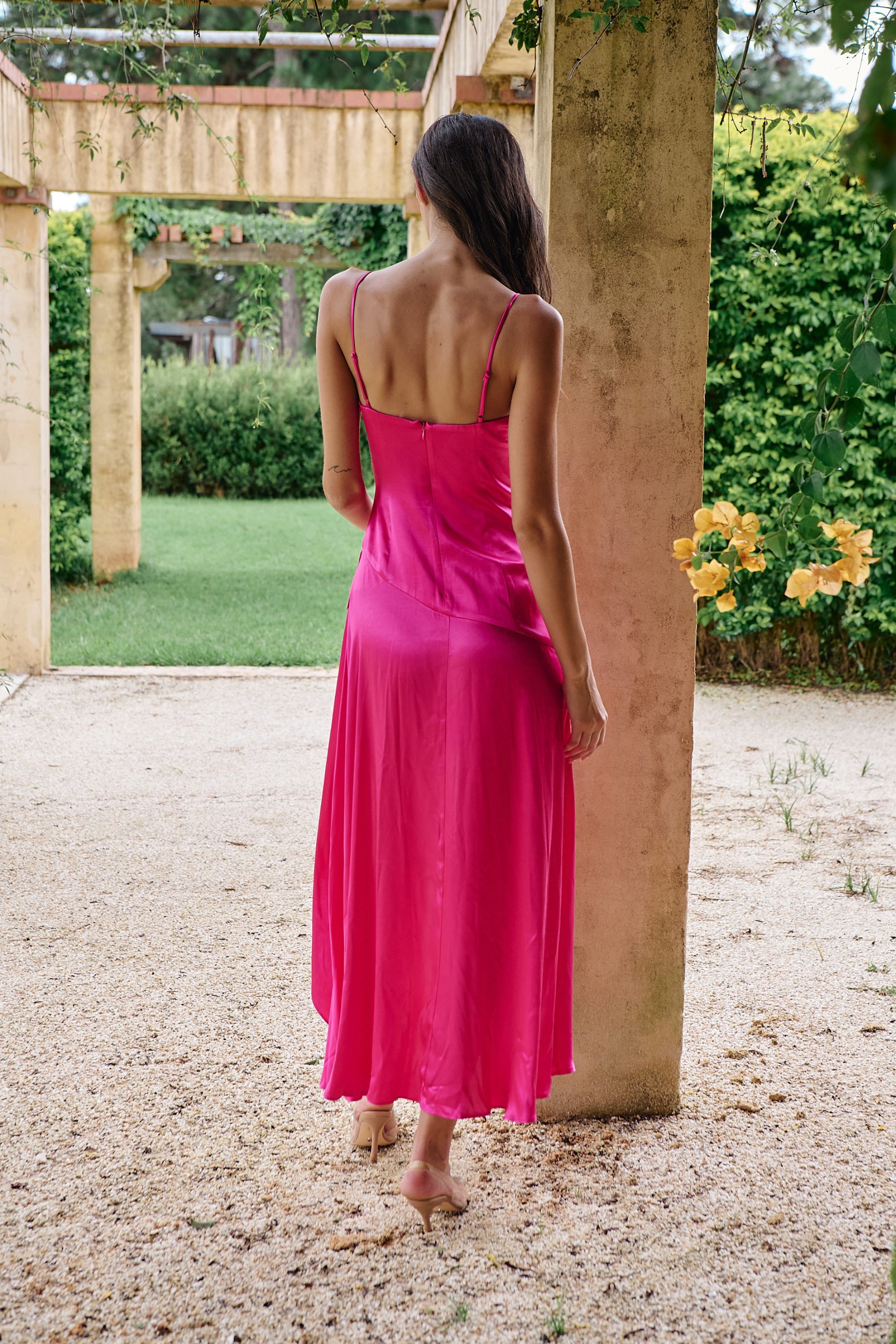 Make an entrance in the Sorella Midi Dress—a bold fuchsia statement piece designed to move with you. Cut from glossy satin with a fluid drape, this asymmetrical beauty features a wrap-effect bodice, delicate adjustable straps, and a flowing high-low hem that catches the breeze with every step. Whether you're dancing at a summer wedding or headed to a rooftop soirée, the Sorella is made for moments that matter.