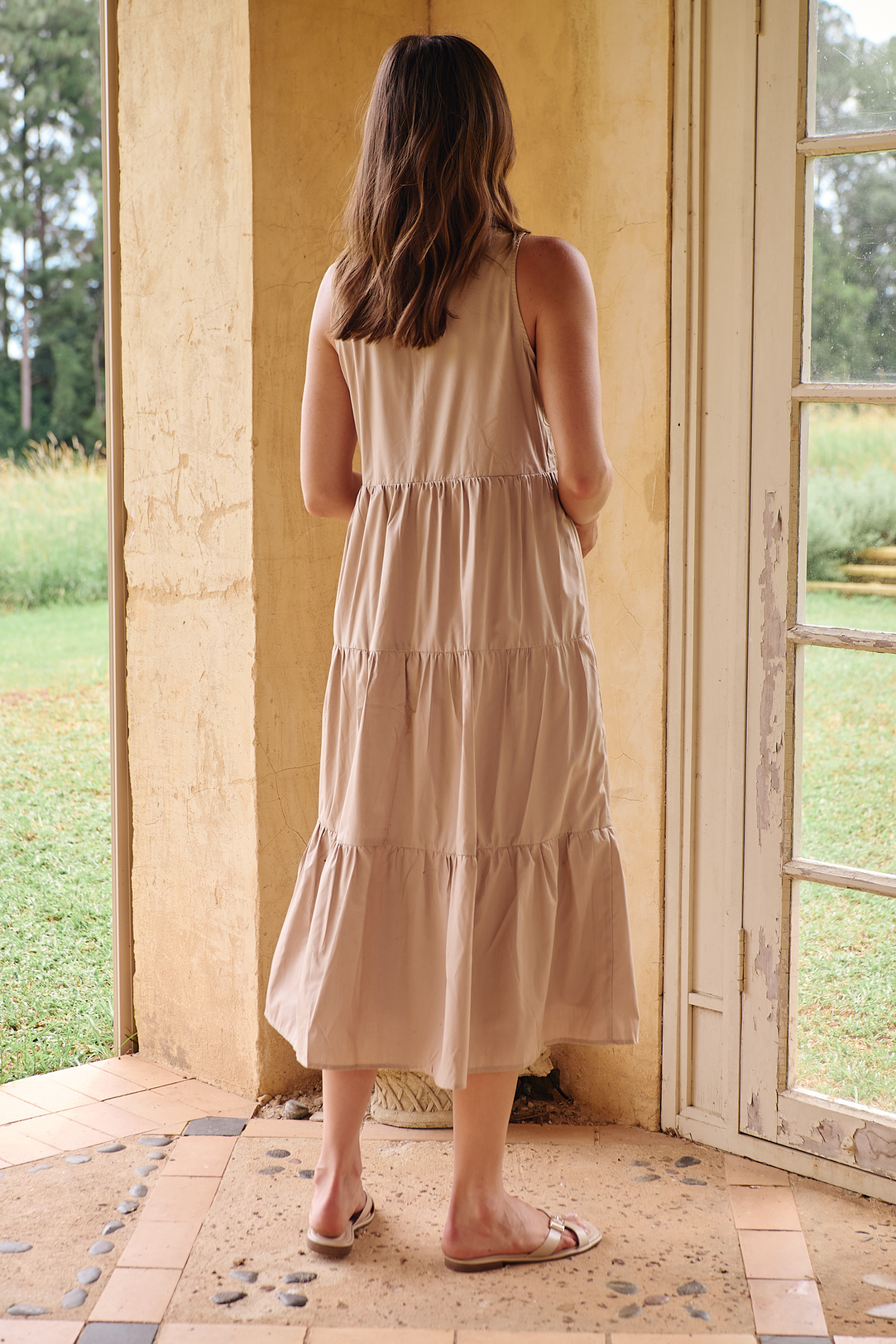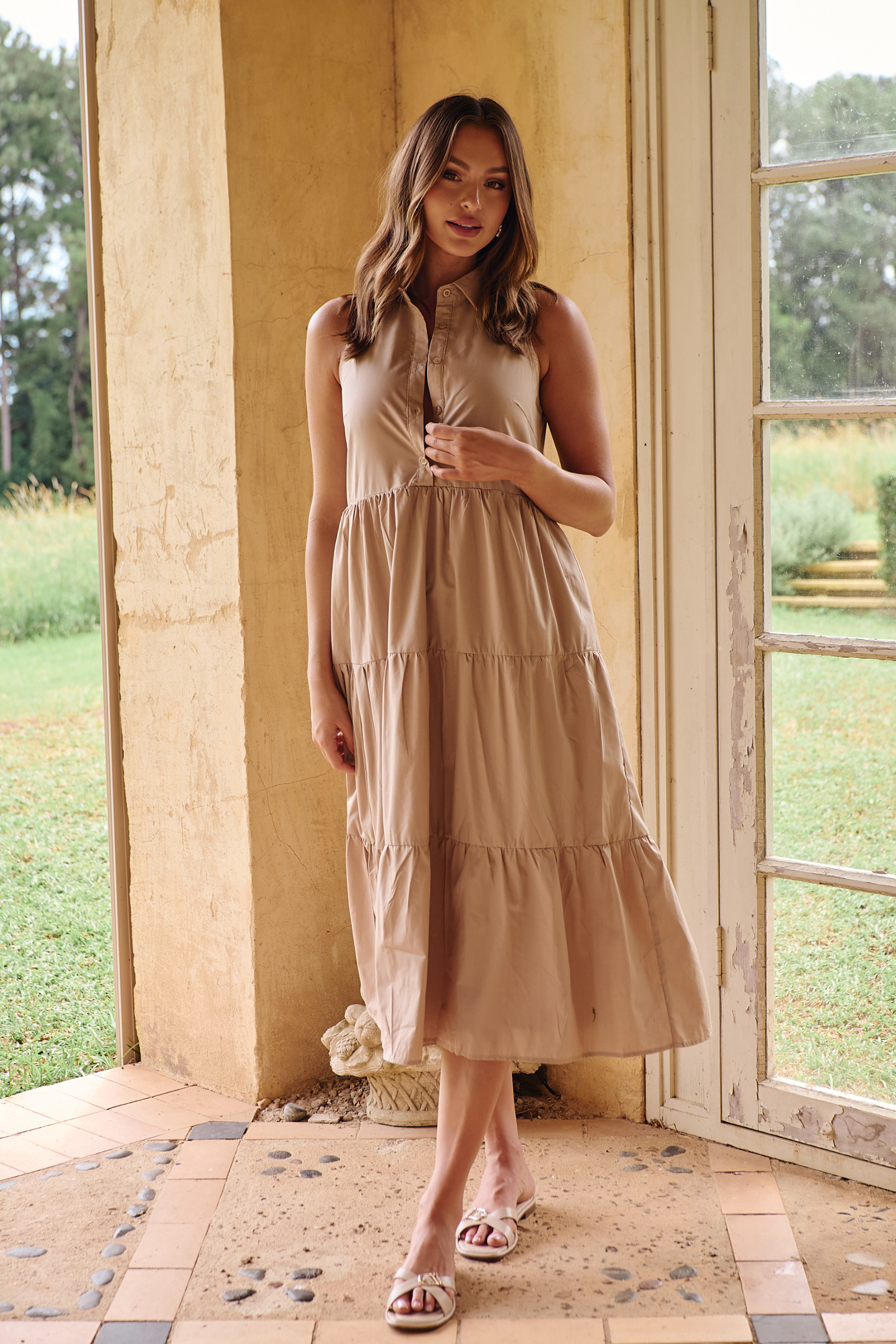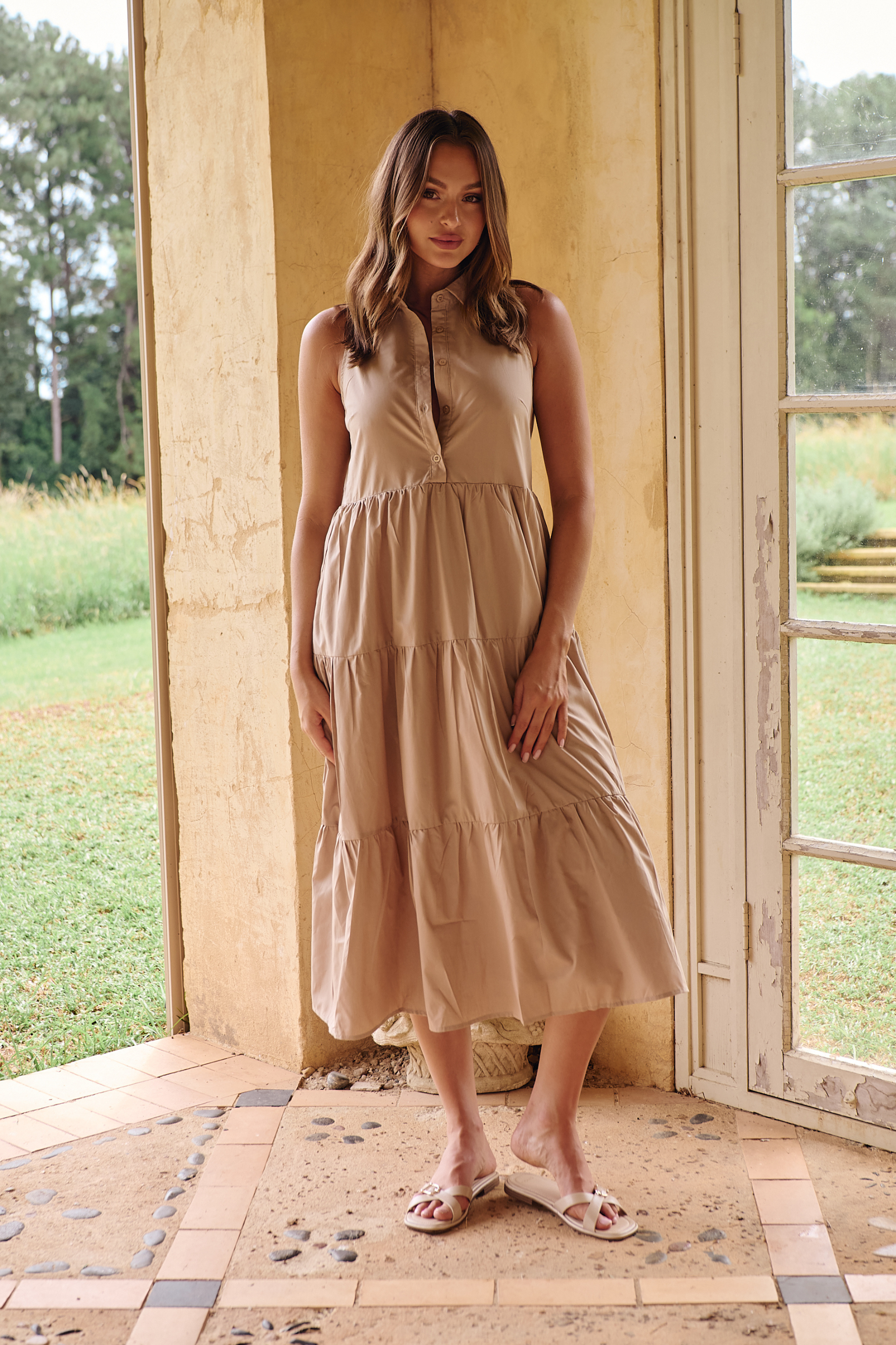 Meet your new everyday essential – the Kimbra Maxi Dress is the perfect blend of softness, ease, and understated polish. Crafted in a light, breathable cotton-blend fabric, this sleeveless design features a structured collar, a partial button-up front, and a relaxed tiered silhouette that flows with every step. Whether you're heading out for weekend errands or lounging in the sun, Kimbra brings effortless charm to any moment. Just add sandals and you're set.