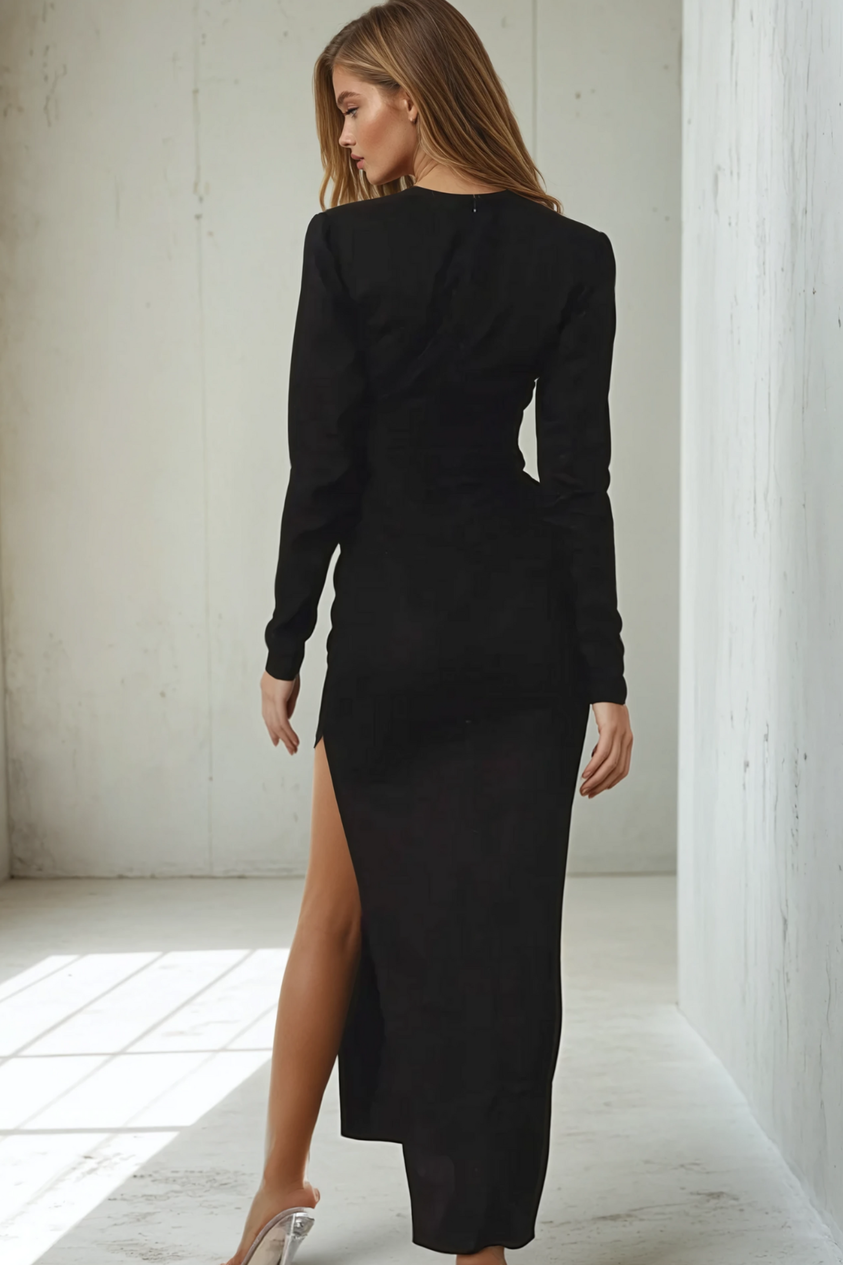 Meet Amélie — a modern French muse made for statement nights. Designed in recycled linen, this cut-out maxi dress balances sophistication with a bold edge. Featuring a sculpted twist bust, high leg split, and sleek long sleeves, it's your go-to piece for when elegance meets drama.