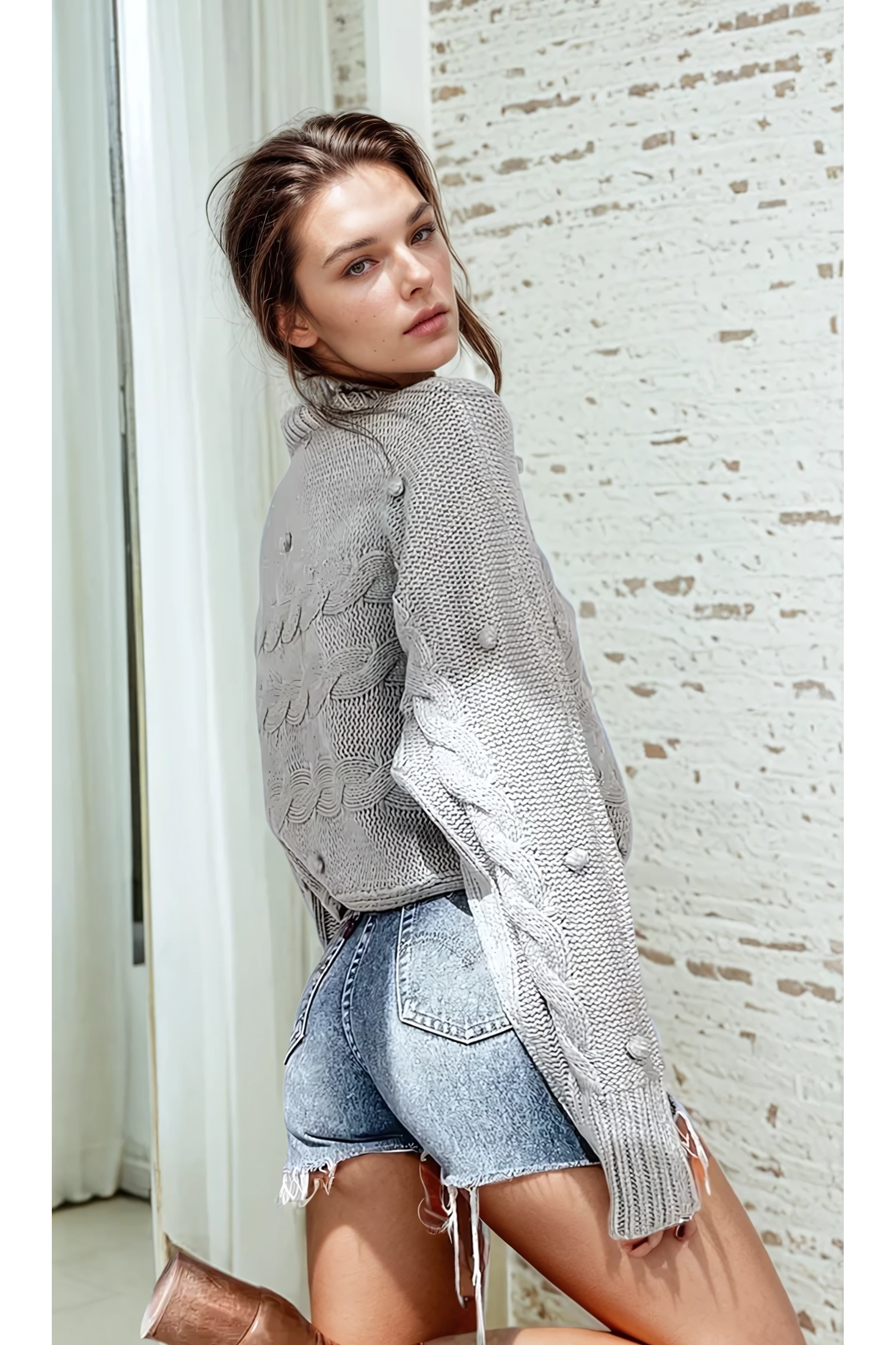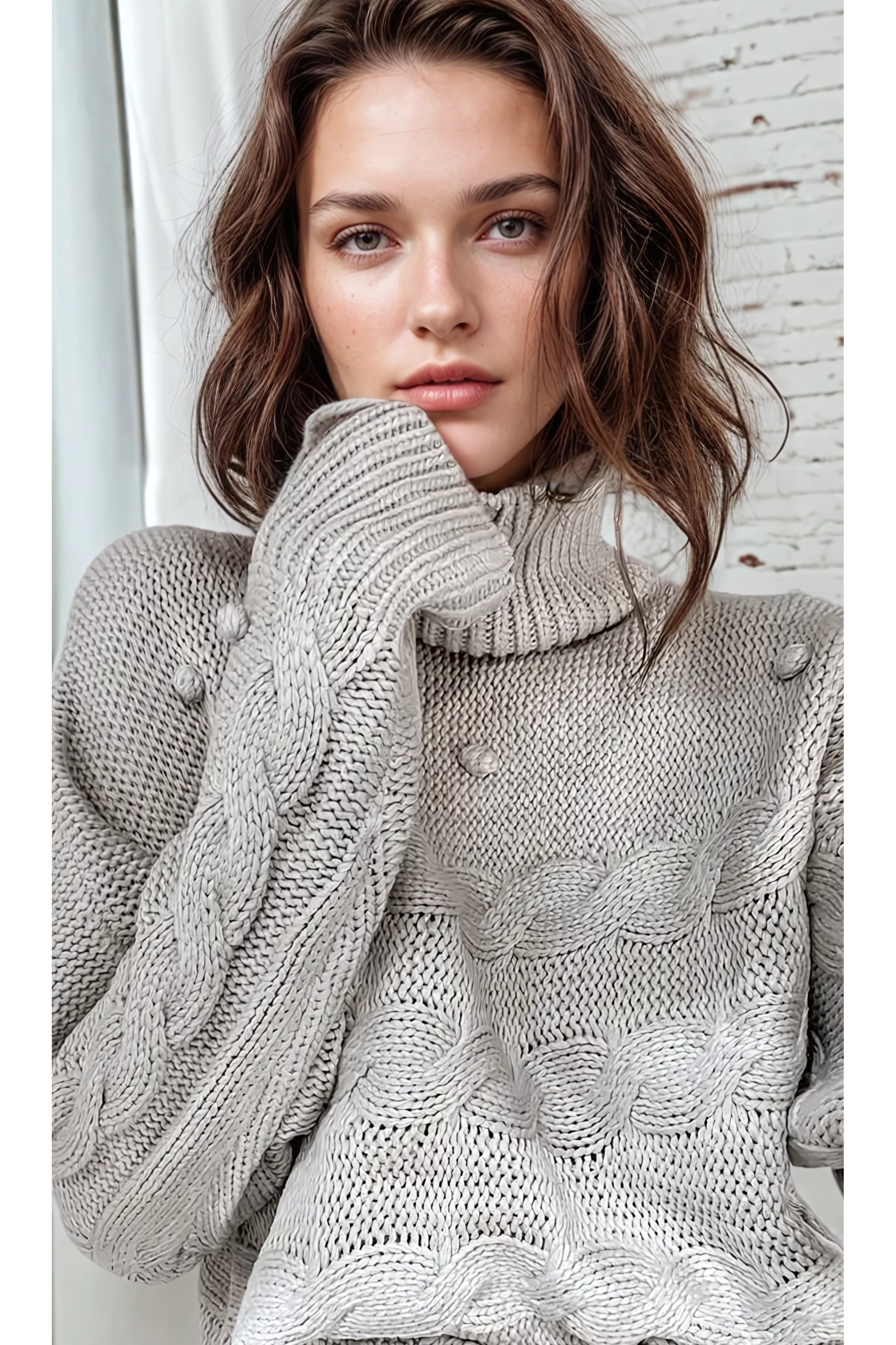 Wrap yourself in timeless texture with the Cosette Knit Jumper. Featuring a thick cable knit pattern and playful pom-pom accents, this high-neck sweater is your go-to piece for cozy yet elevated style. The relaxed fit, extended sleeves, and neutral tone make it easy to pair with denim, leather, or layered under coats for the colder months. It’s soft, structured, and effortlessly chic.