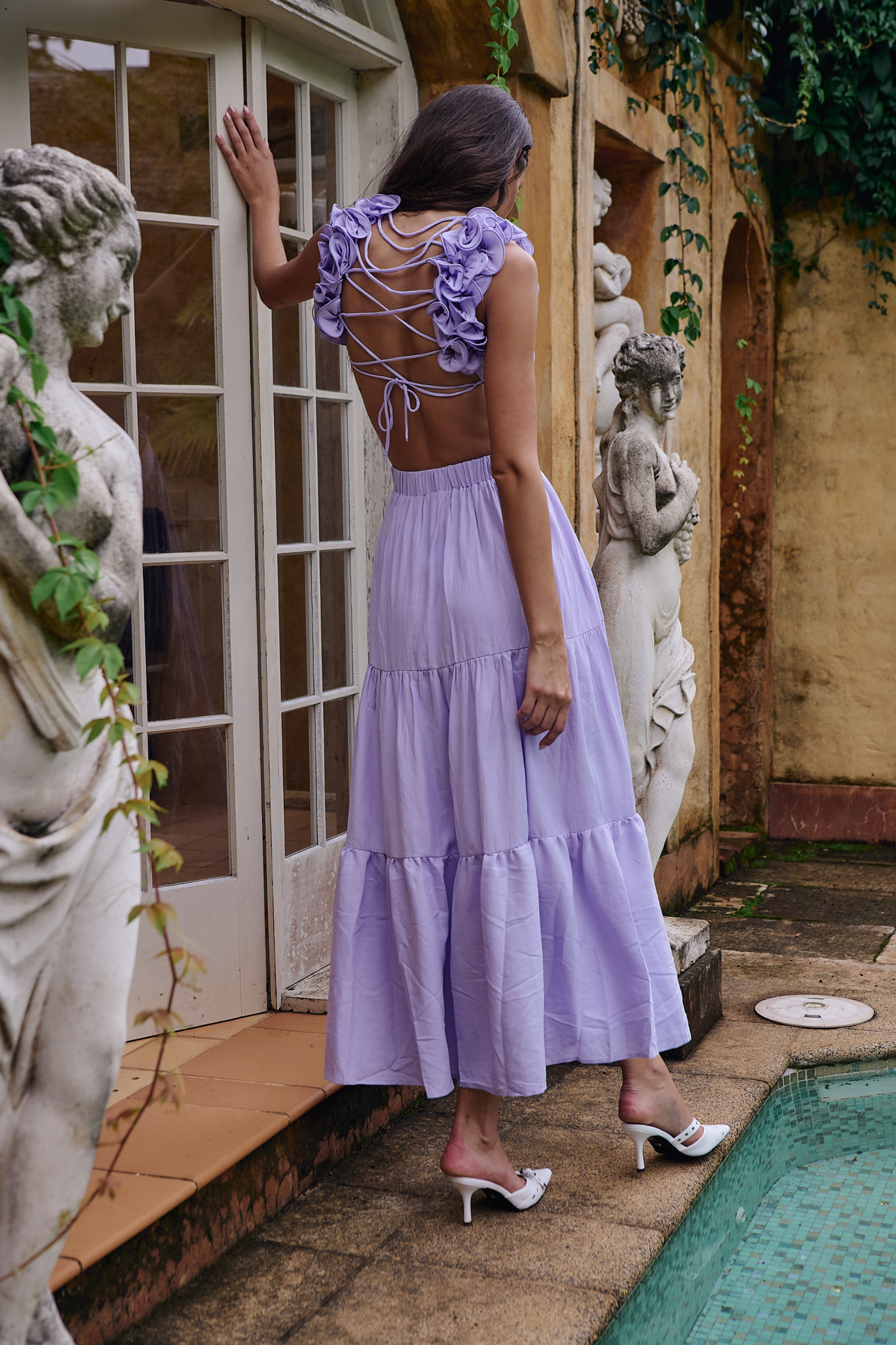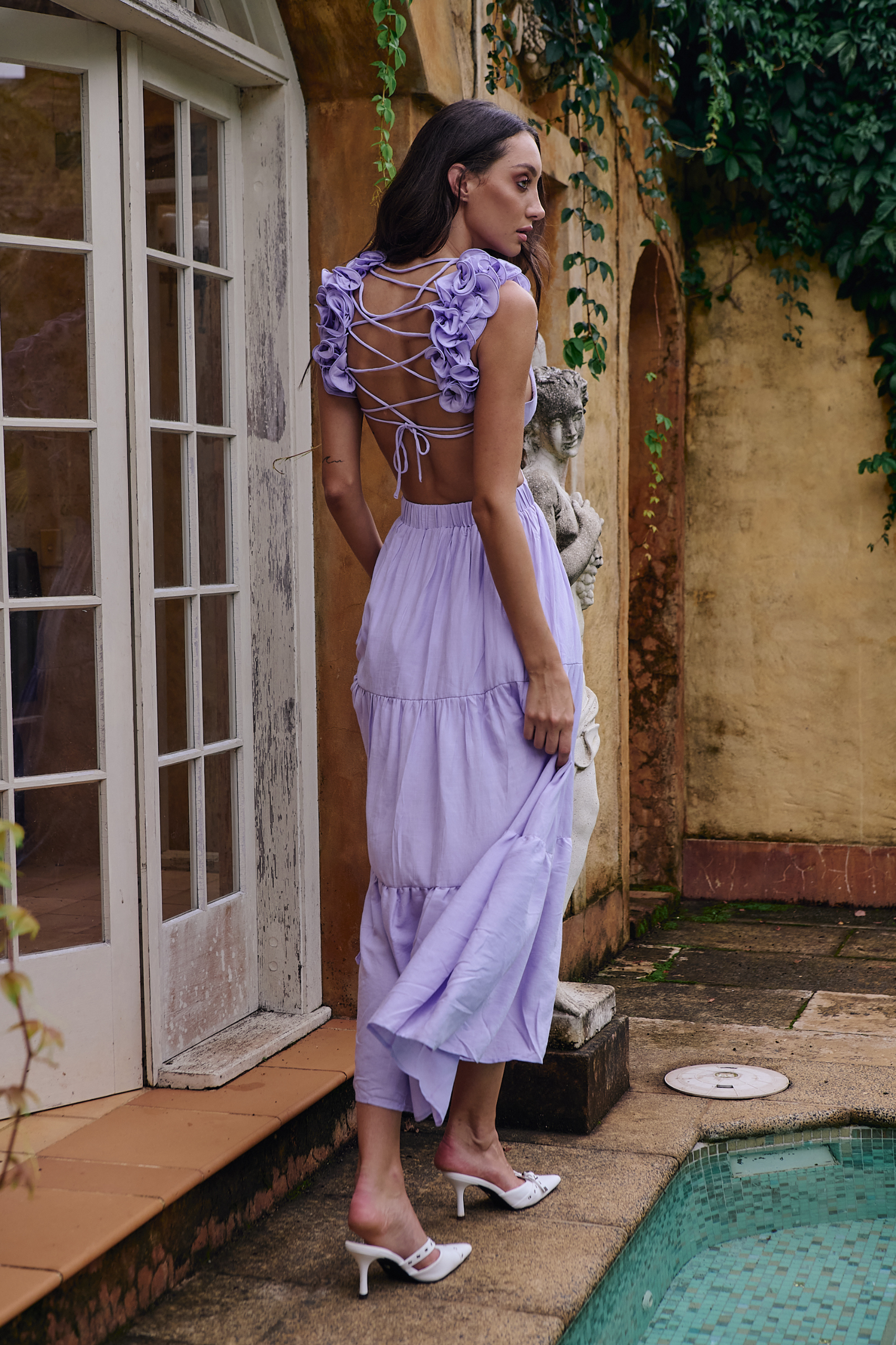 Soft, sculptural, and designed to captivate — the Delta Maxi Dress is the ultimate romantic statement. Featuring a flattering cross-front bodice, a flowing tiered skirt, and intricate 3D floral appliqué at the shoulders, this dress is a dream for summer occasions. The open lace-up back adds a striking touch, while full lining ensures an effortless, comfortable fit. Elegant from every angle.