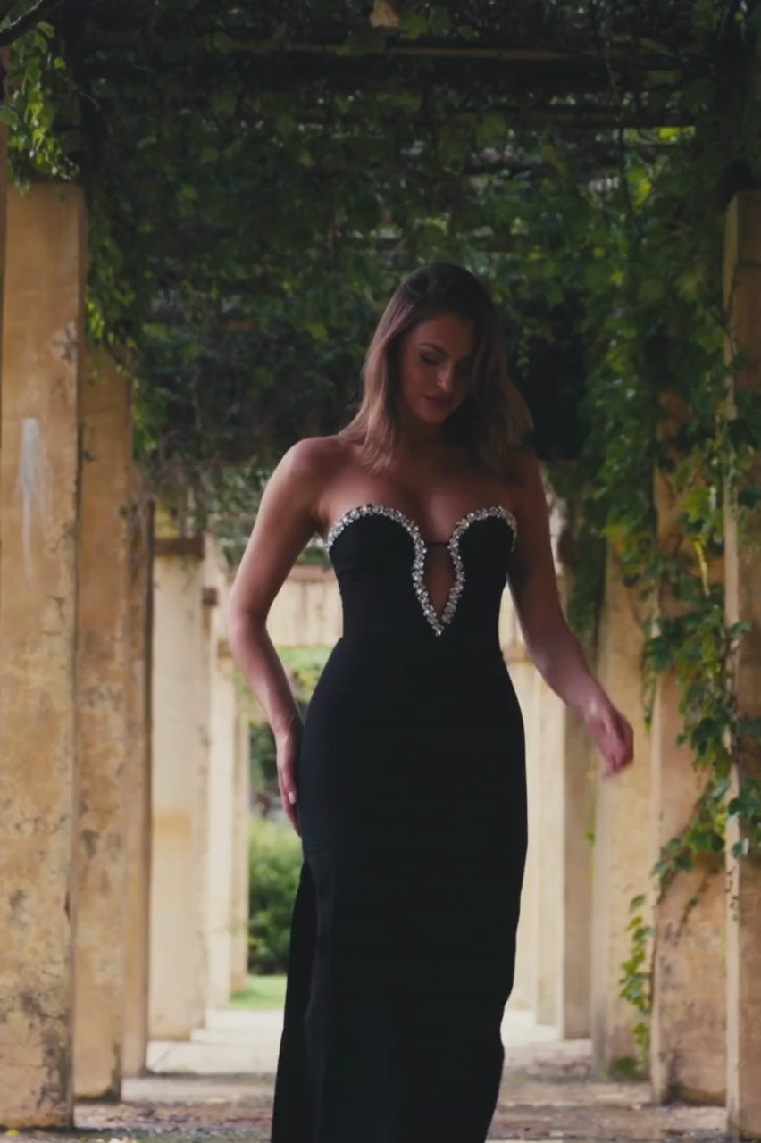 Designed to make an entrance, the Eleni Diamanté Midi Dress brings elegance with a bold edge. Featuring a sculpted plunge neckline trimmed in dazzling diamanté embellishments, this form-fitting silhouette hugs your curves and captures the spotlight. Perfect for evening soirées, romantic dinners, or black-tie moments — this dress is made to be remembered.