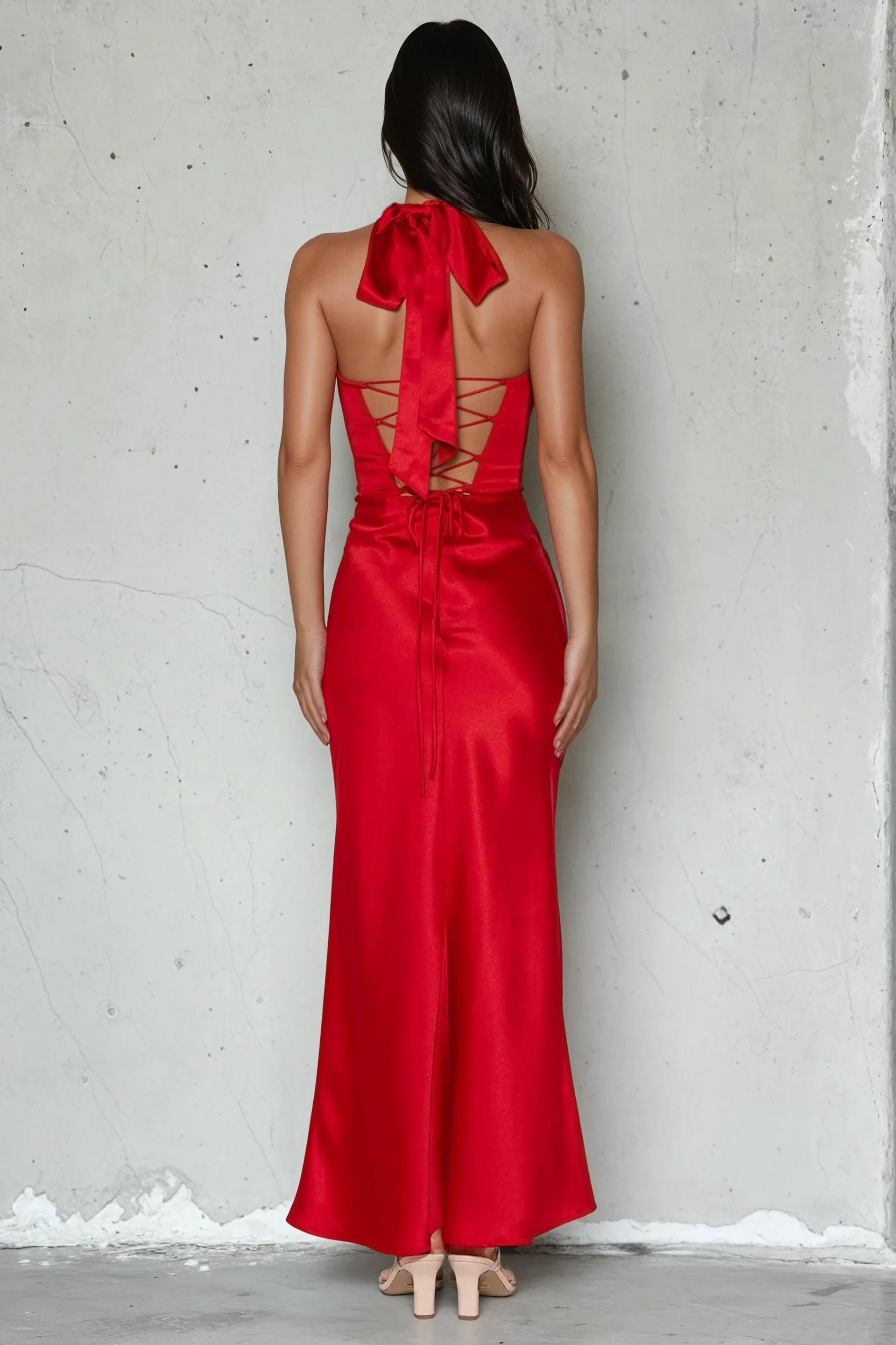 Graceful yet undeniably bold, the Élodie Dress is made to leave a lasting impression. Crafted from glossy scarlet satin, this halter-style gown features a quilted bustier neckline for a touch of texture and structure. The silhouette flows effortlessly into a figure-skimming skirt with a thigh-high slit for added drama. A statement rosette neck tie adds a couture finish, while the open lace-up back allows for a custom fit. Elegant, striking, and unforgettable — this is your red moment.