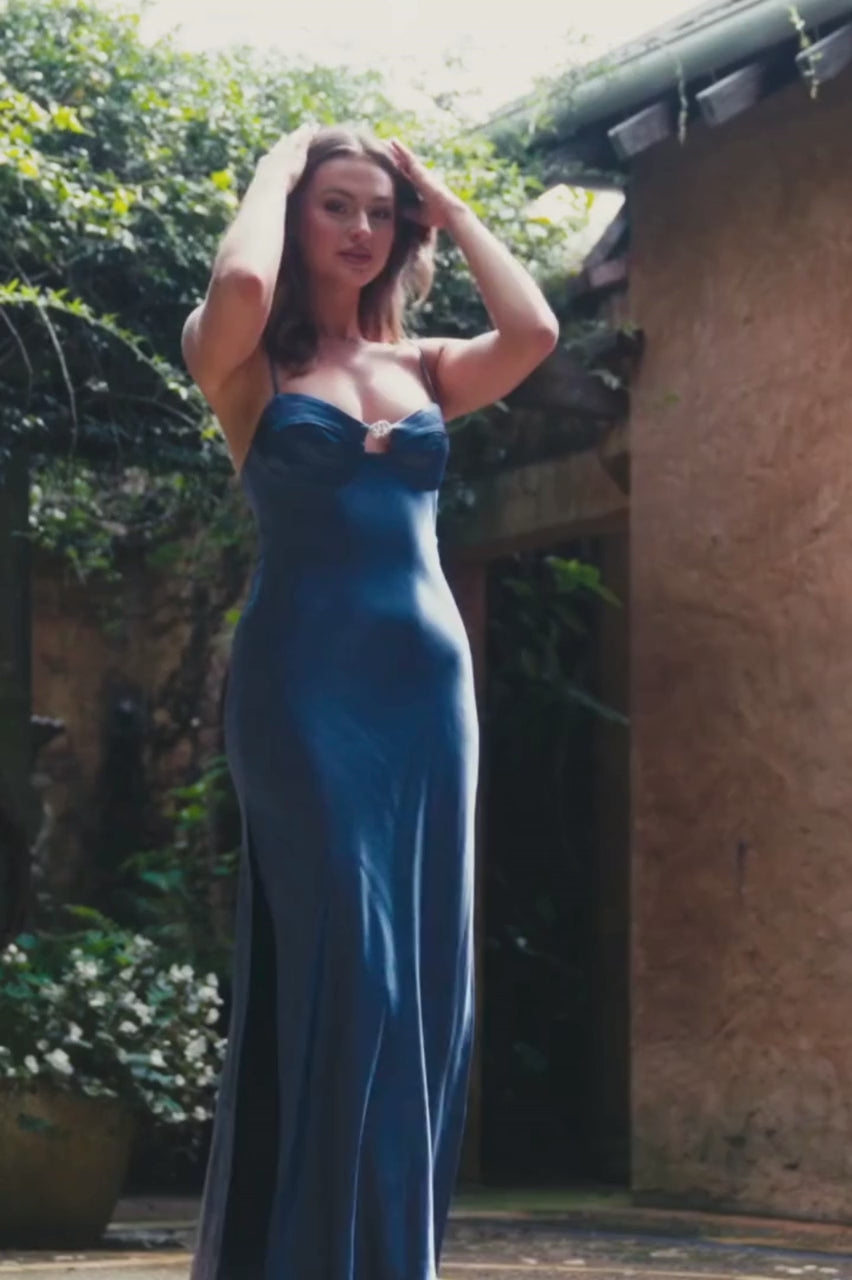 Turn every entrance into a statement with the Fleur Rouge — a sultry satin gown designed for unforgettable nights. Cut from lustrous scarlet satin, this dress drapes like liquid fire over your silhouette, hugging in all the right places. The structured bust is adorned with a dazzling diamanté floral brooch, adding a touch of timeless glam to its flirtatious neckline. A thigh-high slit elongates the leg, while delicate spaghetti straps frame the shoulders for an effortlessly feminine finish. Bold, radiant, and unapologetically muse-worthy — this is the moment, and you are the main character.