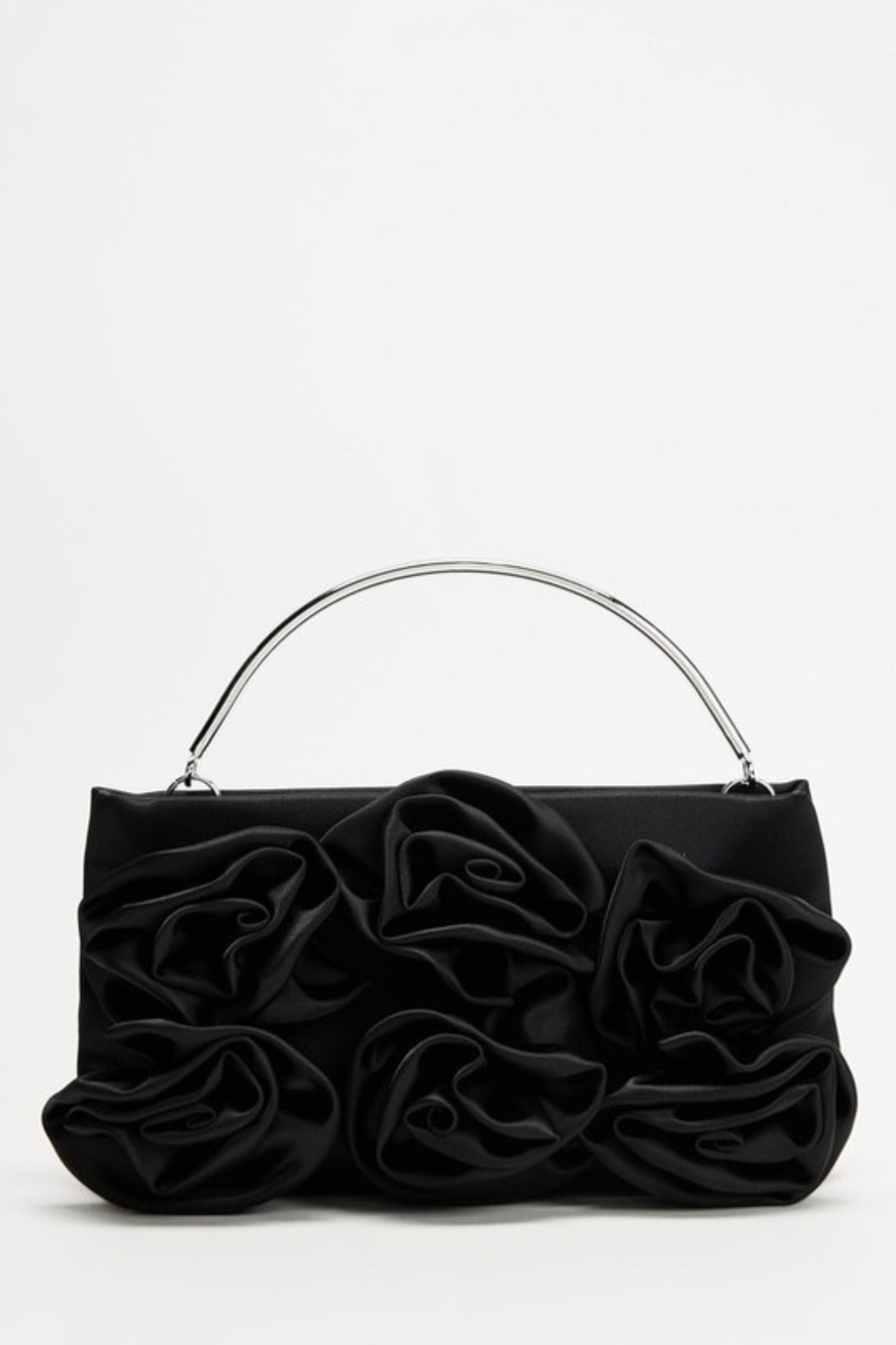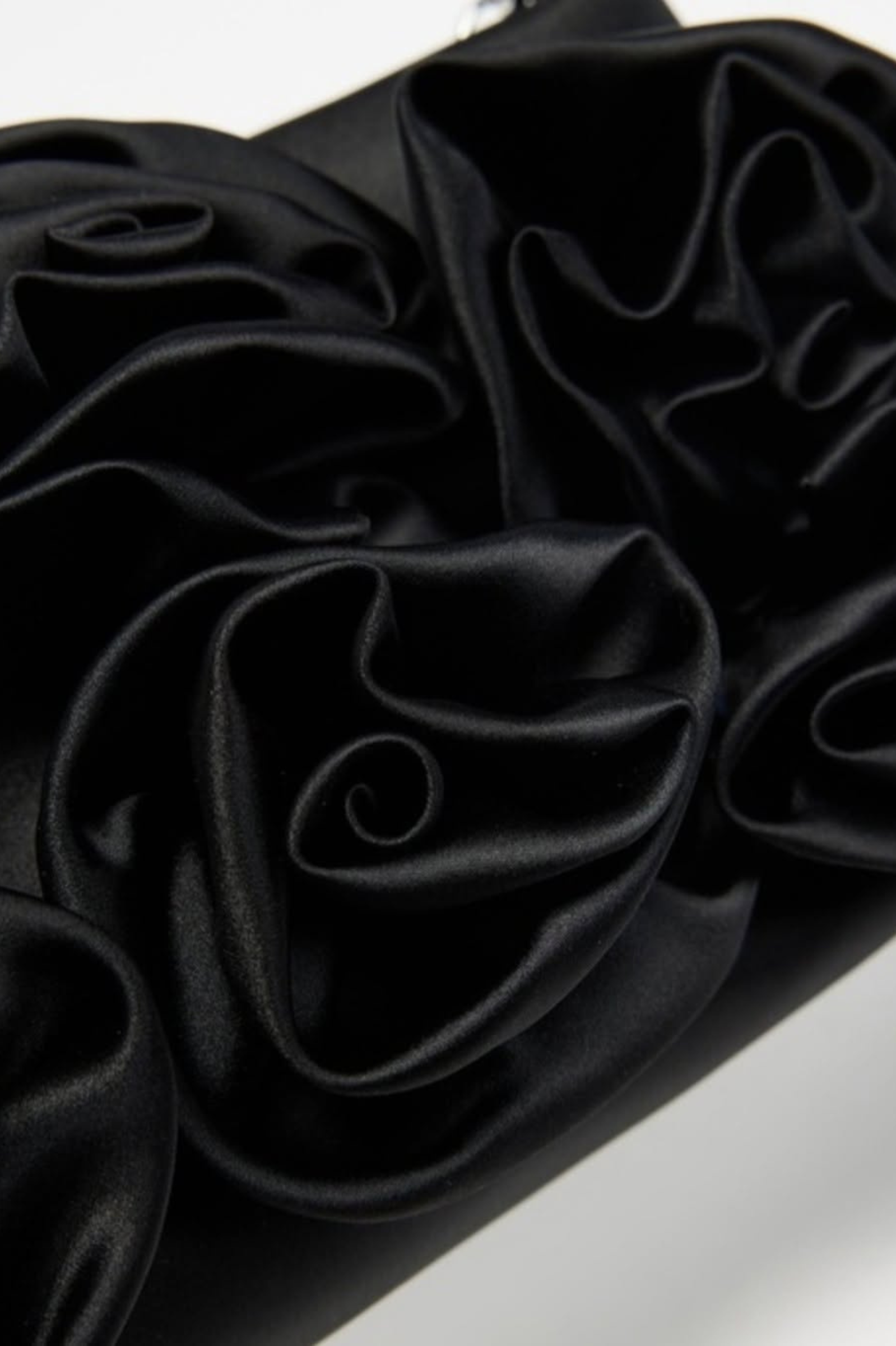 Bold yet romantic, the Flora Handle Bag in black satin is a statement accessory designed to elevate any evening look. Featuring sculpted rosette detailing and a sleek silver-tone top handle, this structured mini bag adds a soft, feminine edge to everything from cocktail dresses to tailored ensembles.
