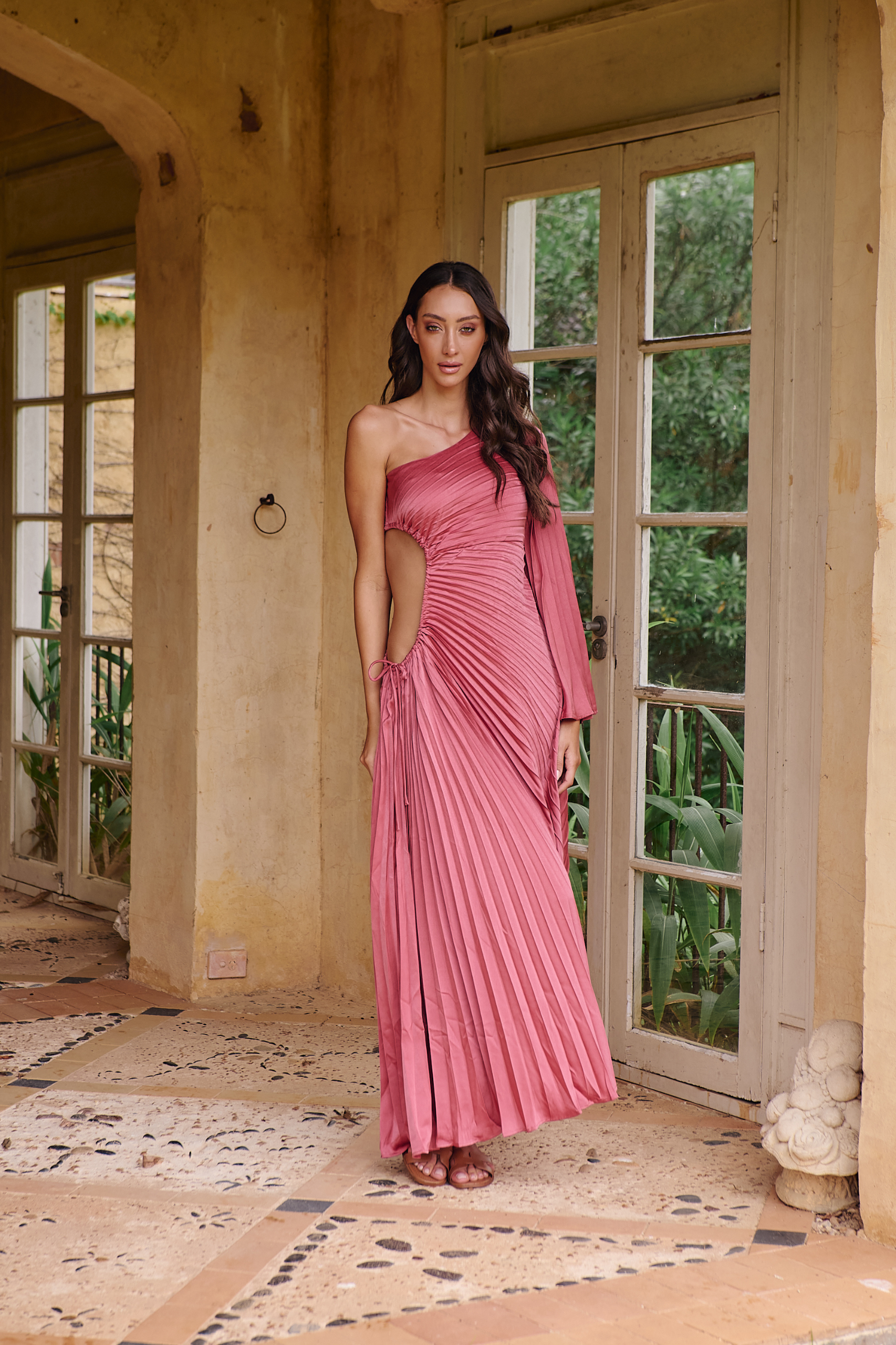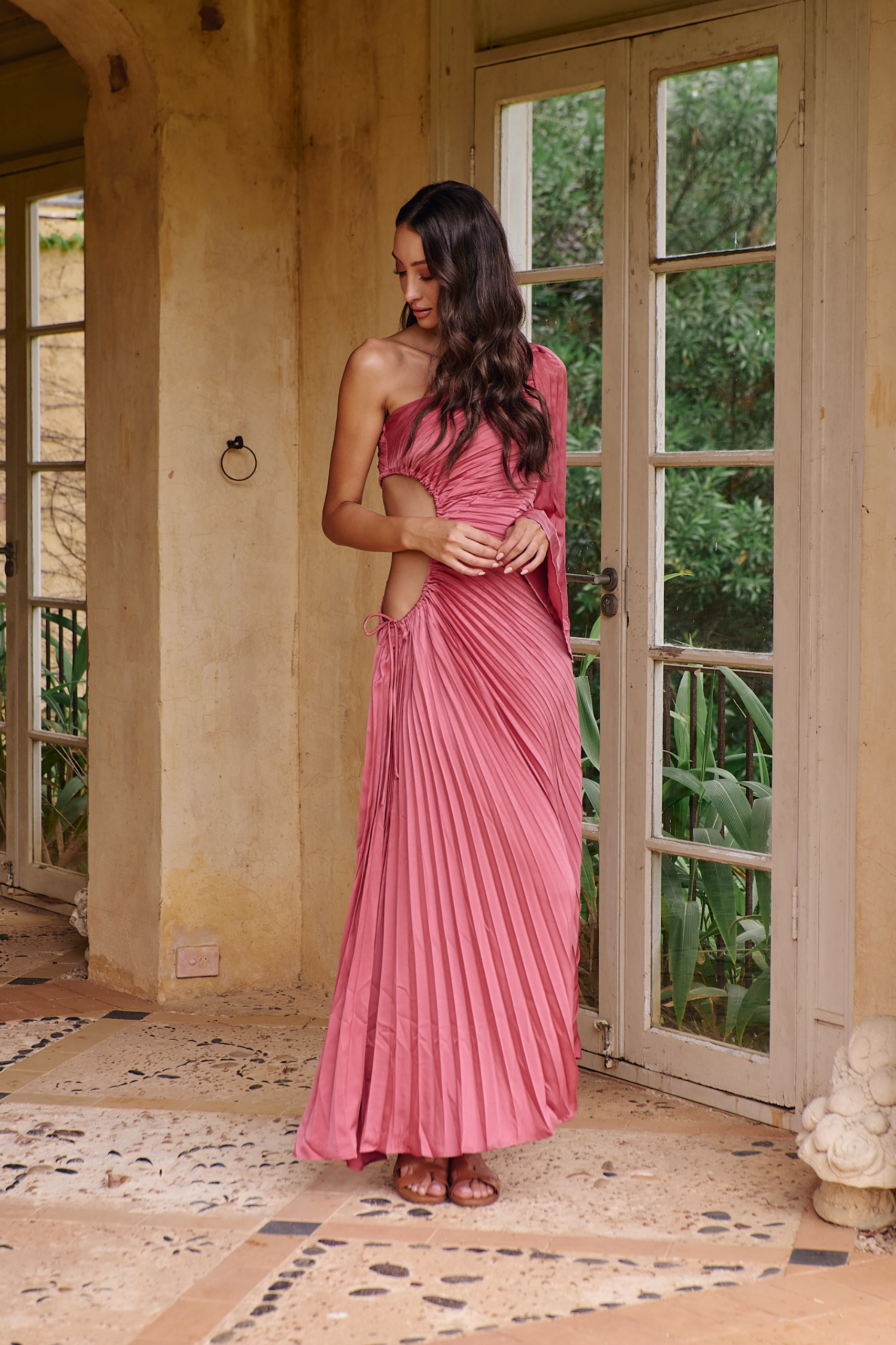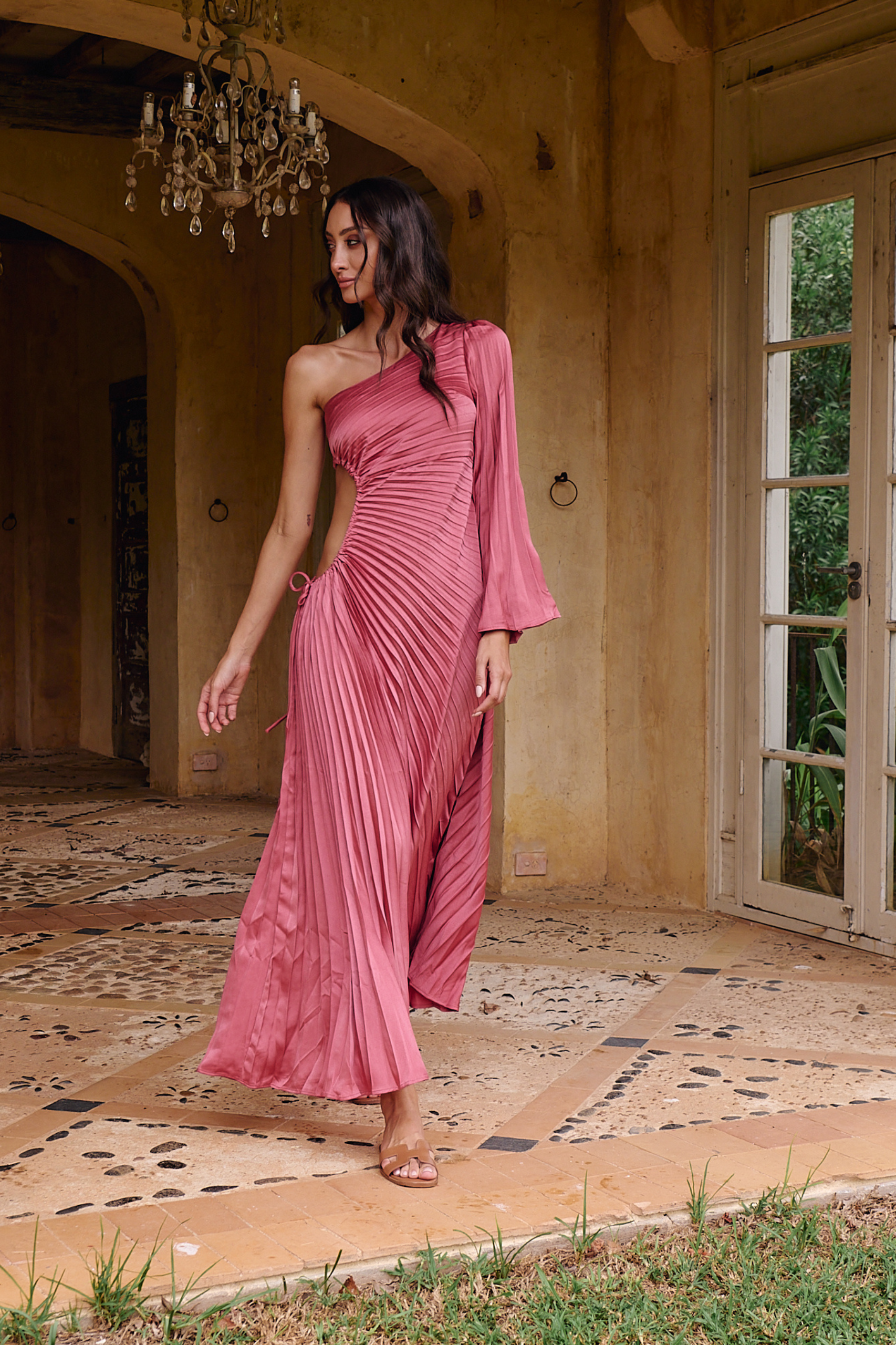 Make a statement in the Land Of Beauty One-Shoulder Maxi Dress. Designed to turn heads, this elegant dress features a stunning pleated style with a daring side cutout and a unique drawstring detail. The one-shoulder silhouette and zipper closure ensure a sleek and flattering fit that’s true to size. Made from non-stretch polyester, the dress is semi-lined for comfort and structure. Pair with heels and soft curls to complete the look for a glamorous night out.