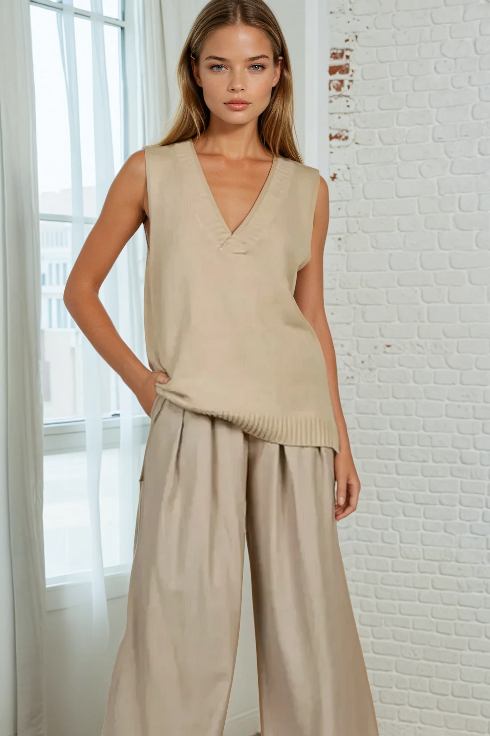 A timeless layering essential, the Molly Knit Vest in Beige blends soft structure with understated polish. Designed with a deep V neckline and relaxed fit, this sleeveless staple adds effortless sophistication to any outfit. Pair it with tailored trousers or style it over a crisp shirt for a modern take on minimal dressing.