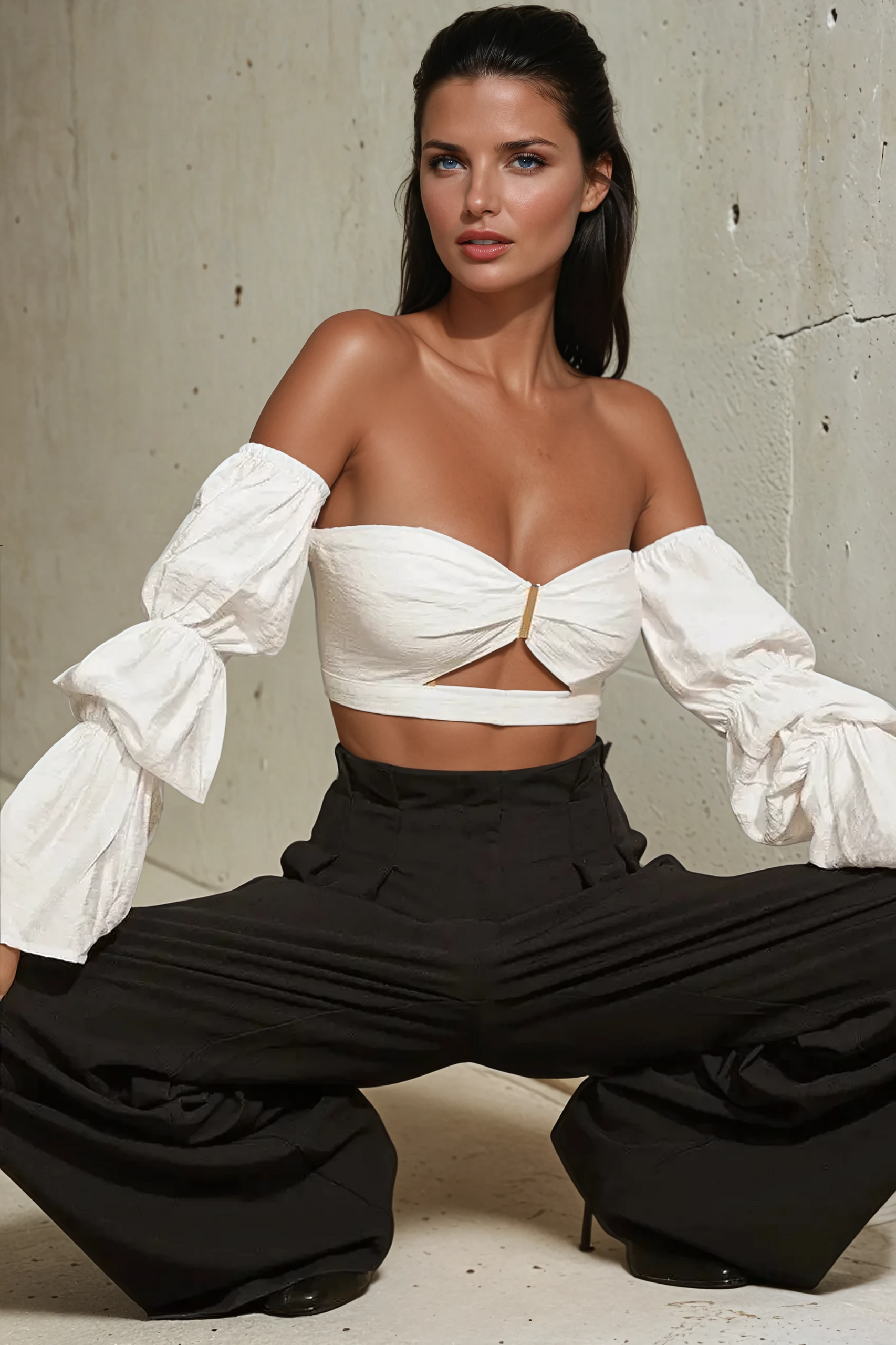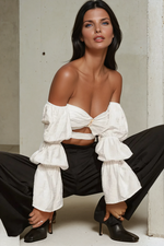 Command attention in the bold and chic Romee Crop Top. This strapless piece brings drama with its gathered puff long sleeves and structured front detail, including a gold centre bar and a subtle cut-out under the bust. Crafted in a lightweight black fabrication, it's the perfect statement piece for elevated evenings or fashion-forward day looks. Style it with tailored trousers or a sleek skirt and you're set to steal the spotlight.