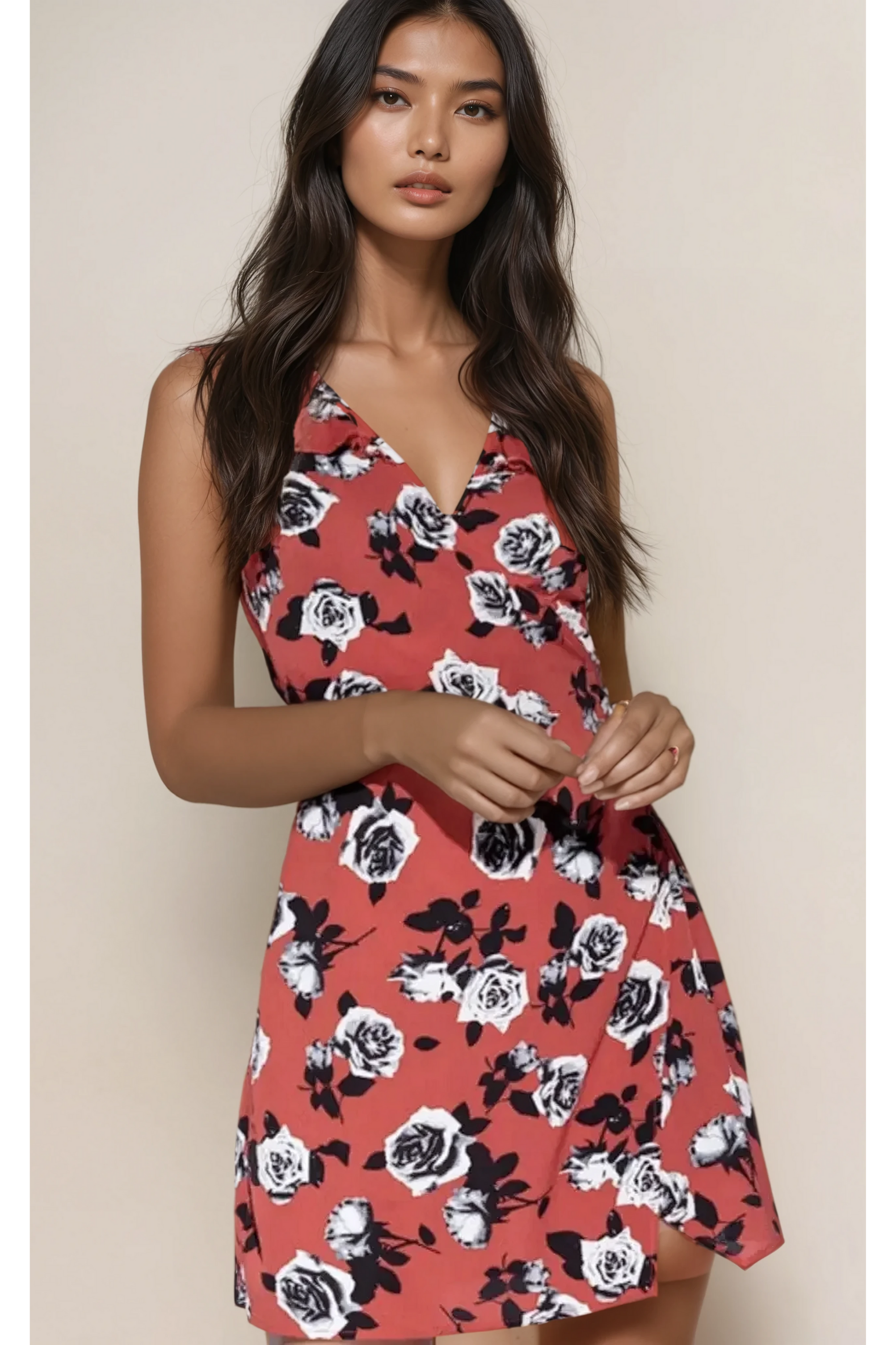 Feminine, flirty, and easy to wear — the Rosa Bloom Mini Dress is your new go-to for sunshine days and warm nights. With its bold red base and all-over rose print, this dress features a flattering V-neckline and relaxed A-line silhouette for a breezy, comfortable fit. Whether you're headed to brunch or a casual date, this floral mini is made to be styled with ease and confidence.