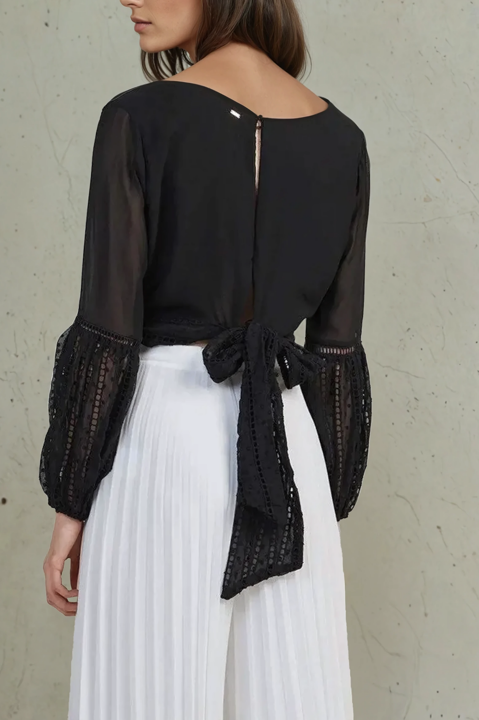 Elevate your wardrobe with the Velora Blouse — a romantic sheer lace wrap top that combines delicacy with drama. Featuring an intricate embroidered pattern and slightly flared long sleeves, this blouse wraps at the waist and ties at the back into a soft, voluminous bow. The plunging neckline and soft fabrication add a flattering and feminine finish, perfect for both elegant evenings or styled down with denim.